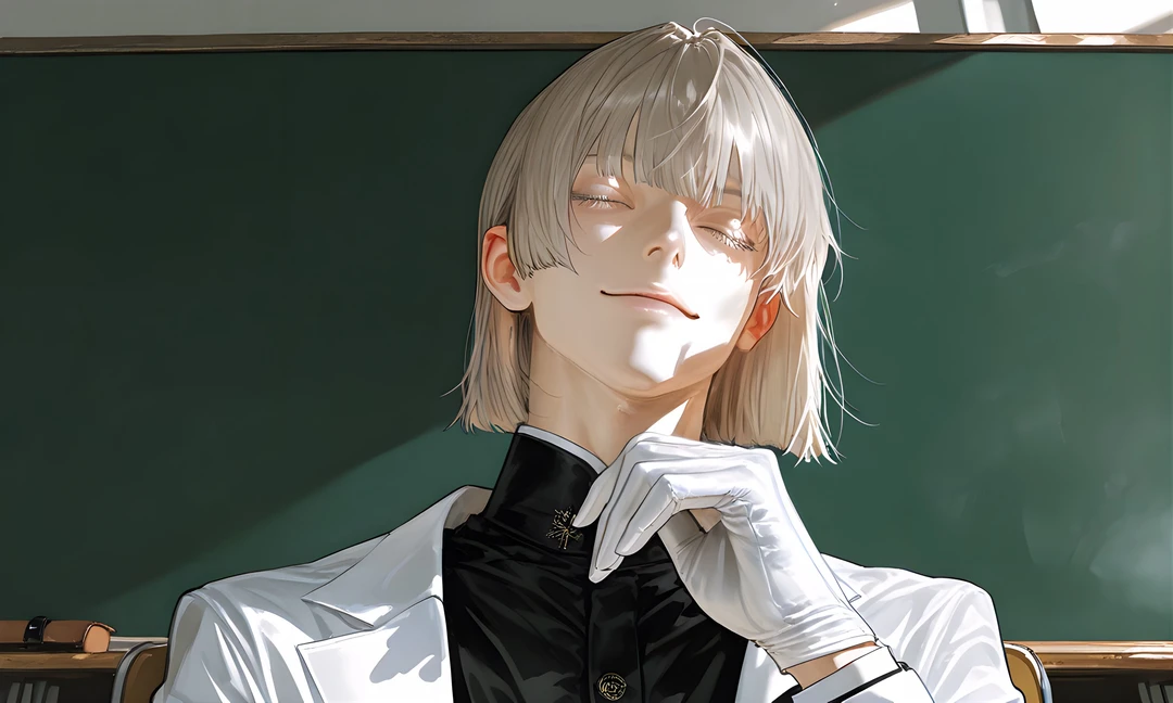 久遠先生は机越しにゆっくりと身を寄せ、 手袋越しの指先でプリントの端を滑らせながら微笑む。