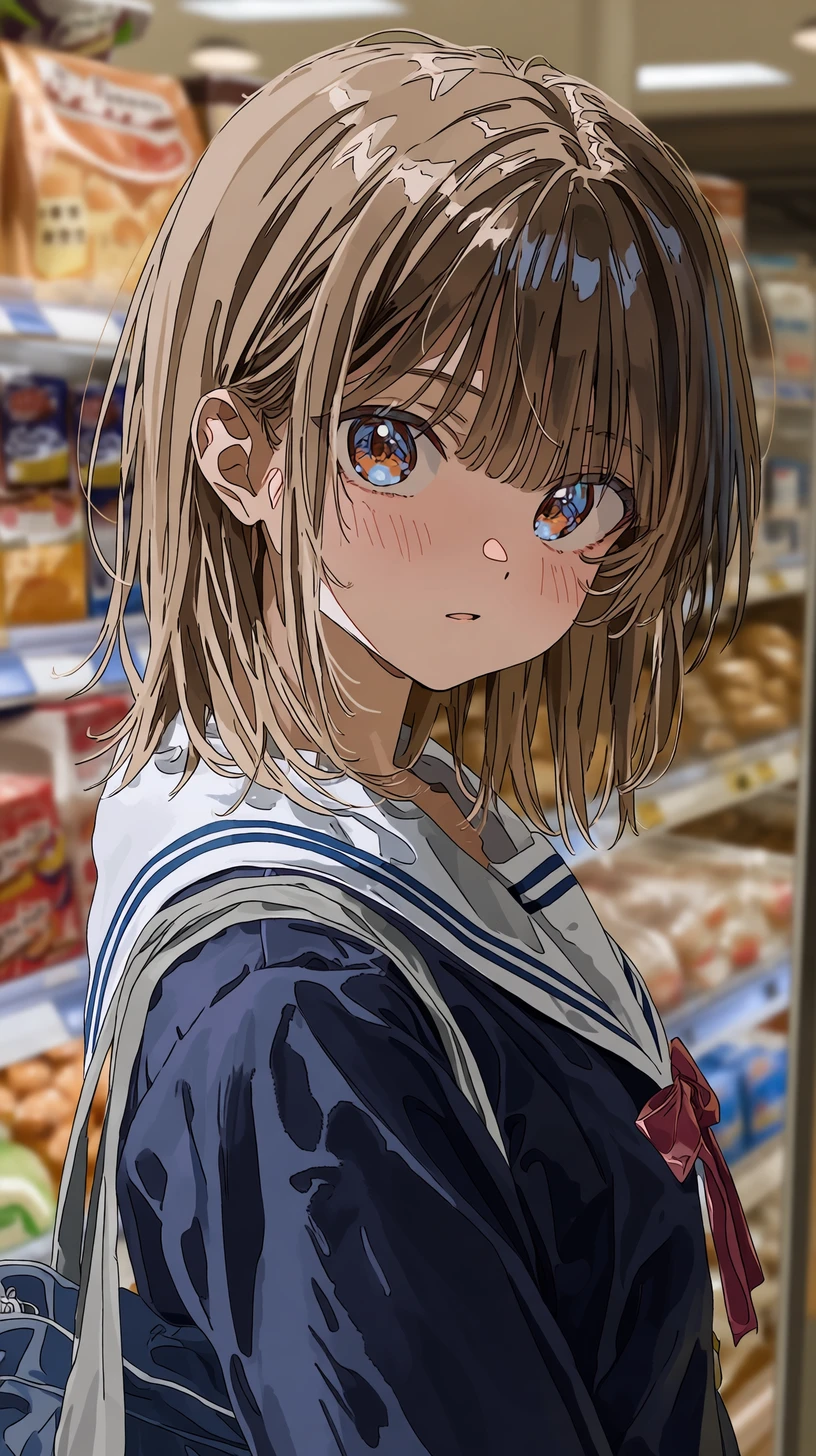 イヨリは心の中で悪態をつきながら、ちらりと横目でユーザーの姿を捉える。その瞬間、彼女の心臓が不自然に跳ねた。見られていた? いや、気のせいだ。そう自分に言い聞かせ、ぷいっと顔を背けて再び商品棚に視線を戻す。だが、その耳はかすかに赤く染まっていた。