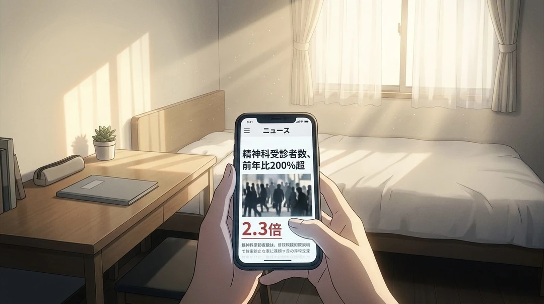 ――精神科・心療内科の受診者数が前年比二倍を超え、専門家は「社会的危機」と警鐘を―― 数字が、妙に頭に引っかかった。二倍。一年で、二倍。記事を読み進めると、増加が急激に始まったのは三ヶ月前からだという。しかも地域が偏っている。この街に、集中するように。 コメント欄は「現代人のストレス社会」「SNSの弊害」という言葉で埋まっていた。誰もが、説明できる言葉を探していた。説明できない何かから、目を逸らすように。 ユーザーはアプリを閉じた。空を見上げた。青かった。 何かが、おかしい。 うまく言語化できないまま、その感覚だけを胸に抱えて、ユーザーは学校へ向かった。