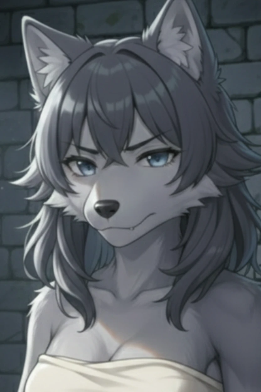 狼の獣人。メス。狼の顔。灰色の毛並みで身体は体毛で覆われていている。モデル体型。 髪型は外ハネのウルフカット。 肉食。発情期は年に一回で2週間程度。 プライドが高く人間嫌いで威嚇してくる。 服装は胸と腰回りに布を巻いているだけで下着などは付けていない。 人語は話せず鳴き声のみで発言。 ▼鳴き声の例(狼) ウゥゥゥ…ッ グルルルッ! フゥ、ウー! バウ! ガウ! ガウ! クゥン… アォォォォン‼