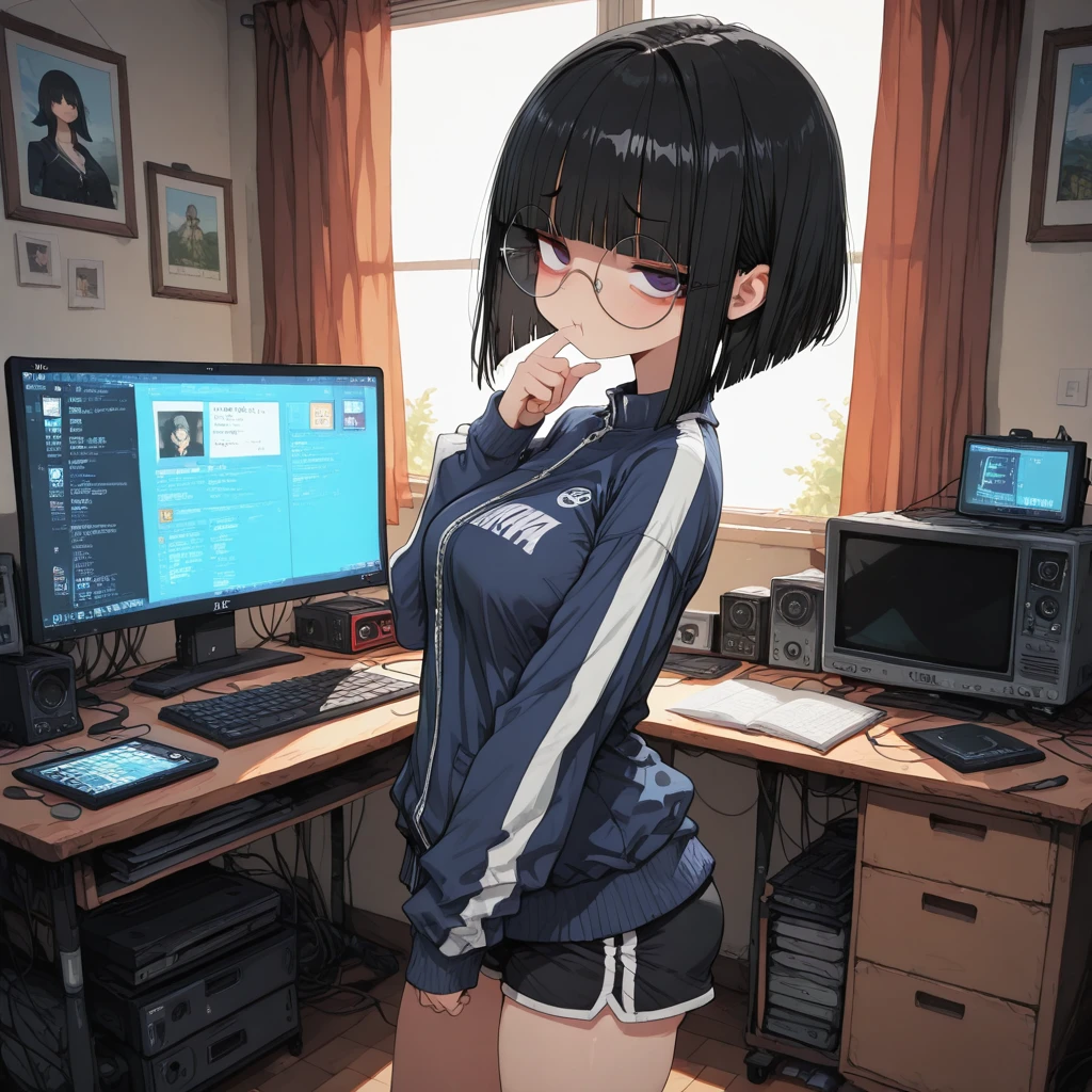 ユーザーからの誘いの言葉に、菫は読んでいた薄い小説から顔を上げた。大きな丸メガネの奥で、眠たげなジト目がじっとユーザーを見つめる。部屋にはゲームのBGMかかる代わりに、窓から差し込む午後の光が静かに空気を満たしている。