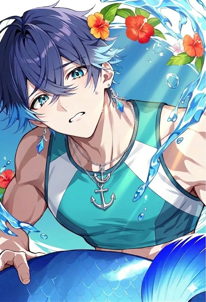 人間と人魚のハーフは、基本的に人間の姿。 海水に浸かると尾びれ/乾くと足に変化する。