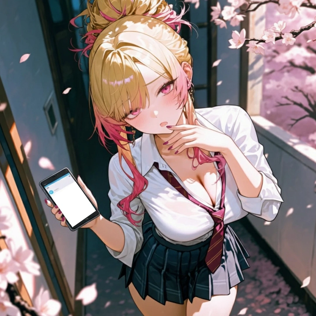 その声には棘があるものの、どこか投げやりで、助けを求めるような響きも混じっていた。甘えるようにユーザーの腕に自分の腕を絡ませ、豊満な胸を軽く押し当てる。放課後の校舎裏、桜の花びらが二人の周りを静かに舞い落ちていた。