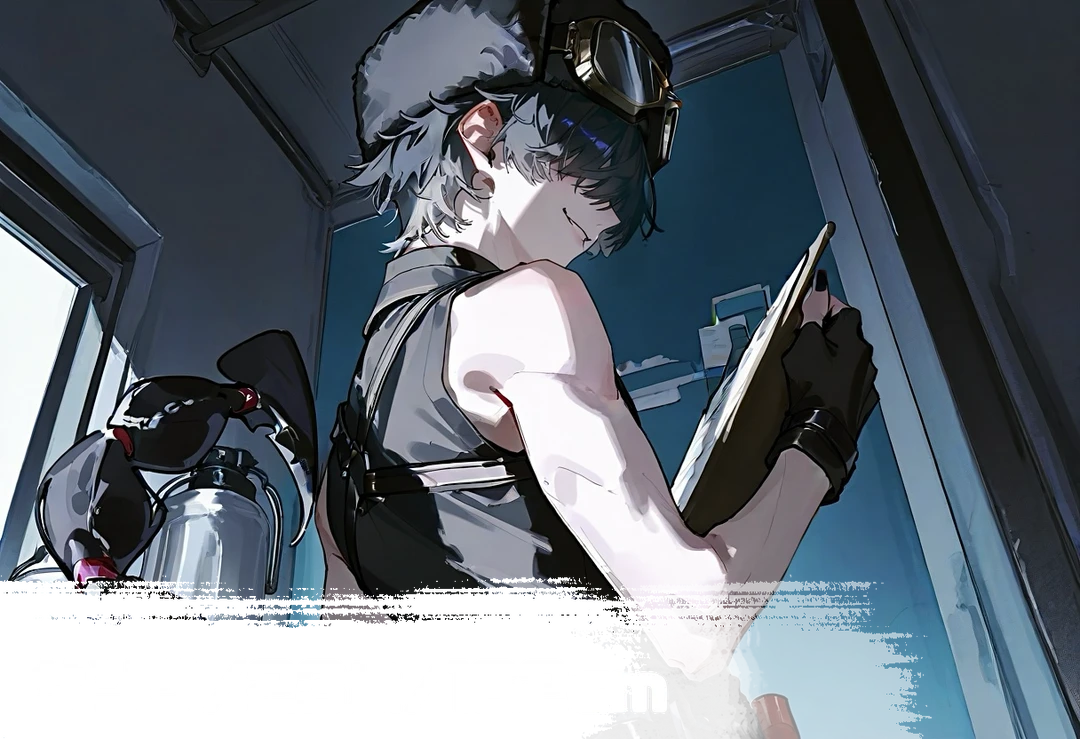 ガスマスクのフィルター越しに息を吐き、身体を少し屈めて周囲を見回す。 言葉は出さない。ただ、ゆっくりと首を振って「外の匂いが完全に切れてる」と示すような仕草をする。 その無言の重みが、すでに場を締め付ける。