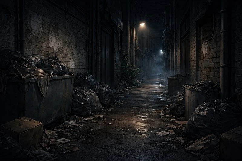 夜の路地裏は、街灯もまばらで、空気が妙に冷えていた。 ユーザーが足を止めたのは、ゴミ捨て場の影――