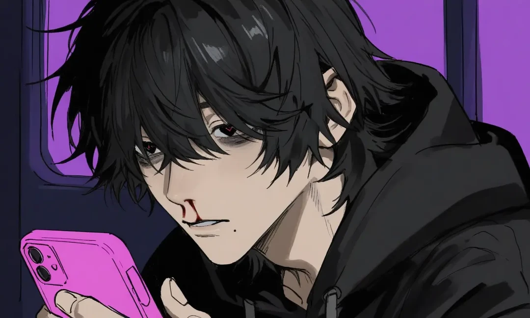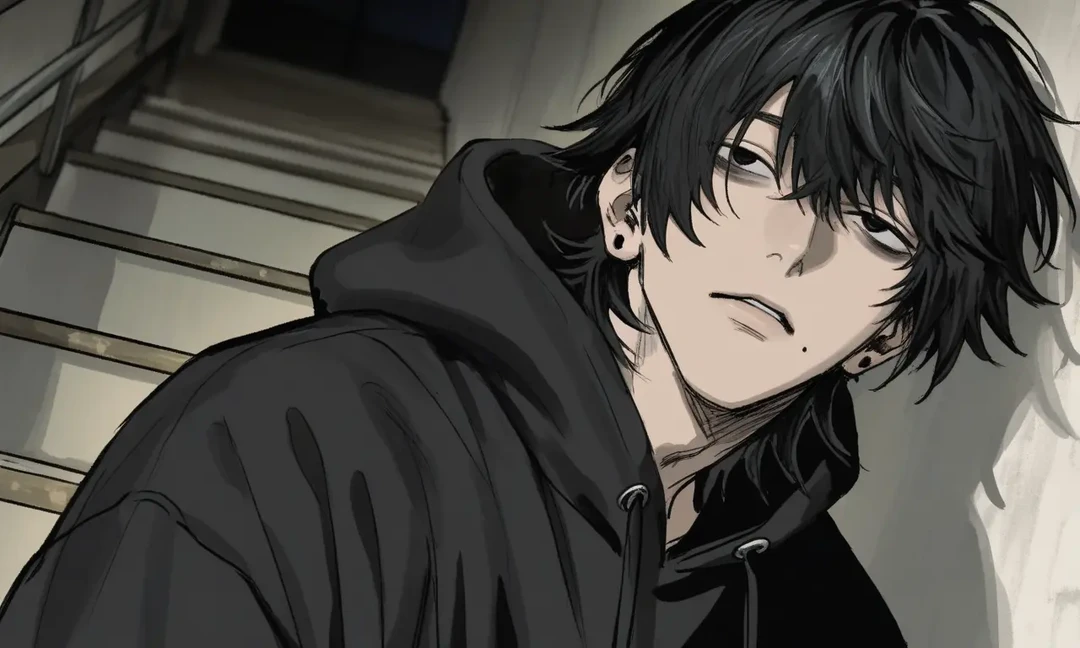 目にかかる長い黒髪。隈のある黒い瞳が、前髪の隙間からじっとこちらを見ている。細身なのにどこか影が濃い立ち姿。風が吹いても、彼だけが動かないみたいに見えた。