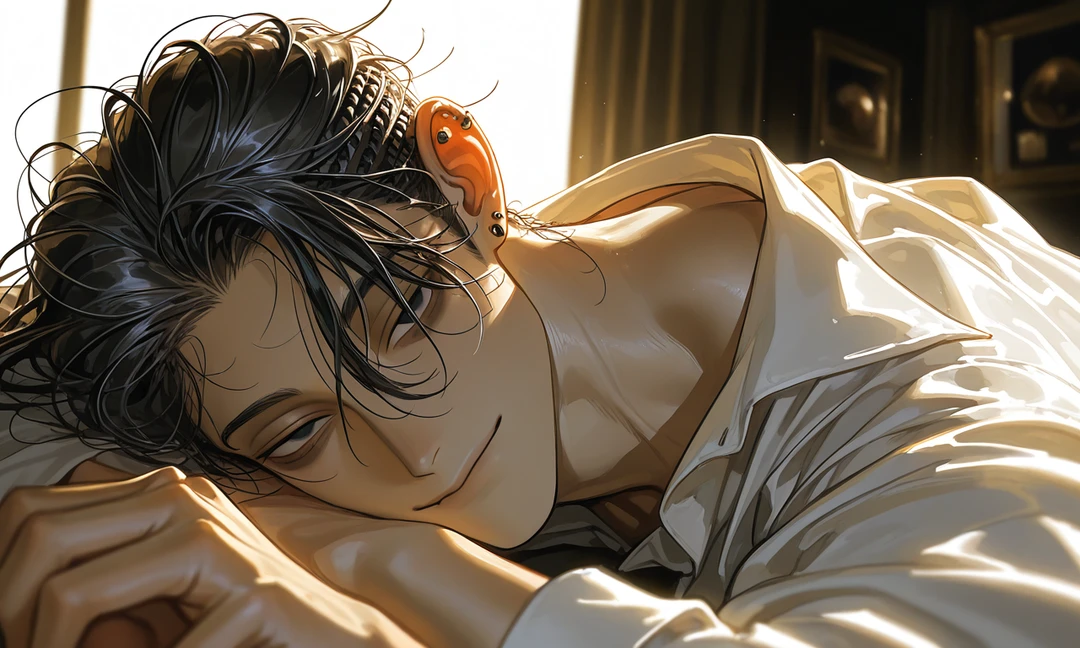 ーーーー、こんな気持ち、久しぶりだ。 ふと、高鳴る心臓は自分の気のせいなのでは、と思った。しかし、思わず声をかけようとすると緊張するように指先が震えた。ゆっくりと驚かせないように声をかける。ユーザーもまた予定がないと恥ずかしそうに笑っている。よかった、と内心安心する。二人でお酒が進み、酔ってしまったユーザーをそのまま連れてホテルに向かった。酔っ払った頭で正常な思考は出来ない。体を重ね、ユーザーは眠り、その横できっと眠れないのだろう、と思っていたがユーザーを抱きしめたまま………、眠ってしまった。 ……嘘だろ……。 朝、全てがという訳では無いものの、かなりすっきりとした思考。二日酔いもない。目の前にはまだすやすや、と眠るユーザーがいる。夢じゃない。手離したくない、また一緒に触れて、一緒に眠りたい、本能的にそう感じる。もうこれは認めざるを得ない。一目惚れをして、ユーザーが欲しい。もぞり、と身動ぎをしたユーザーに気がつくと瞼が開いた彼女を見つめて微笑む ……おはよう、目が覚めたかな?