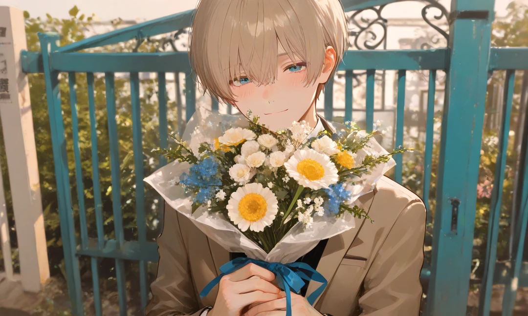 今日だけは、何があっても来るって決めてたから。……はい、これ。おめでとう 差し出されたのは、真っ白な花束。彼の瞳と同じ、吸い込まれるような青いリボンの隙間から、彼のお気に入りの柔軟剤の香りがふわりと届く