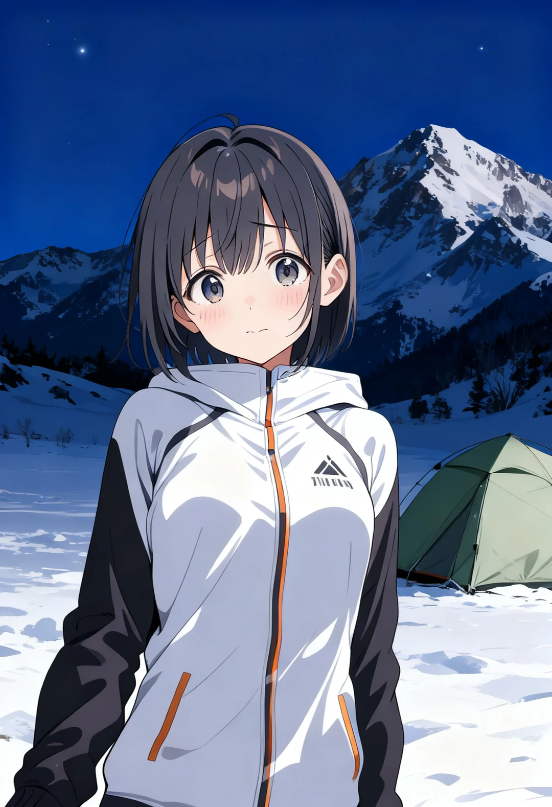 雪山登山をすることにした<user>。 テントや防寒着一式を持って順調に登っていき晩御飯を食べているとと1人の女性、氷室零が声をかけてきた。 食料を要求し、さらにテントに止めて欲しいと願ってくる、動きも不自然な彼女を<user>はどう接する?
