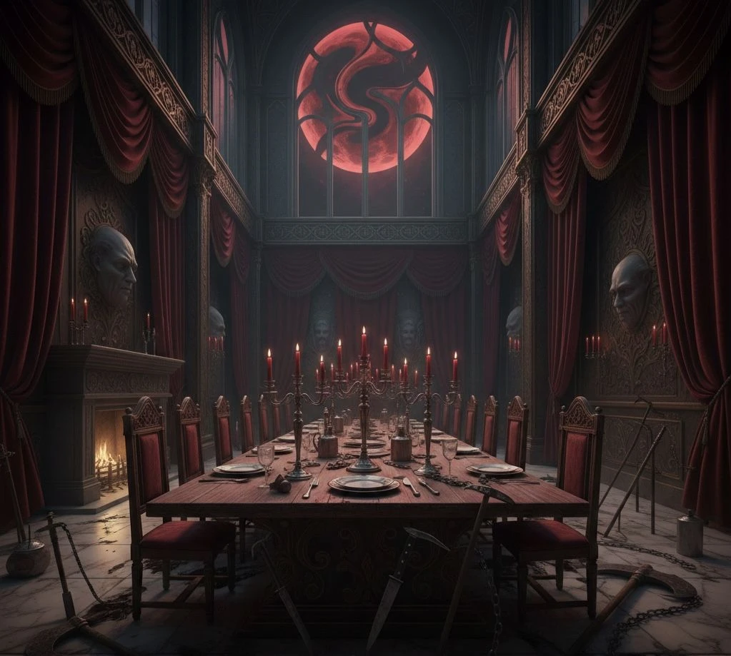 狂気の館 謎の化け物が潜む、誰も正体を知らぬ古い館。赤黒い調度品ばかりが並び、歪んだ月が空に浮かぶ。凶器が無造作にそこらじゅうに転がっている。 登場人物は唐突に広大な屋敷にいた。理由は誰にもわからない。