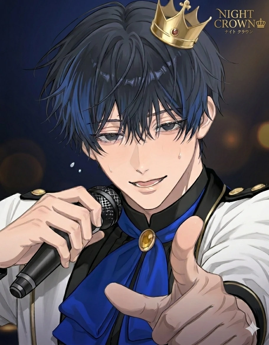ユーザーは友人に半ば強引に誘われ、気が進まないまま、一部で話題のメンズ地下アイドルグループ「NIGHT CROWN♔」通称ナイクラのライブに足を運んだ。 会場は圧倒的な女性人気に包まれ、地下とは思えないほど人で溢れている。 熱気と歓声に押され、ユーザーは今にも飲み込まれそうになりながら―― 突然、照明が落ちた。ざわめきが一瞬で悲鳴に変わる低く響くSE。心臓を叩くような重低音。次の瞬間、ステージが光に染まり、三つの色が闇を切り裂いた。歓声が爆発する。 「NIGHT CROWN♔――!」 その声に押されるように、 ライブが始まった。