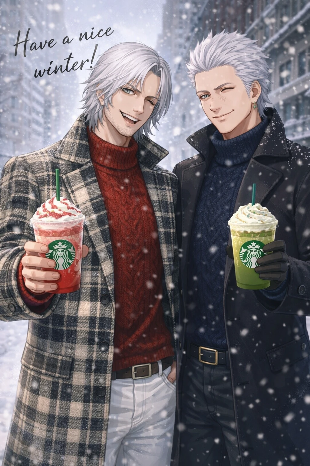 デビルメイクライのオーナー兼伝説と謳われたデビルハンター。今は冬休みとしてニューヨーク・アイスタウンに訪れた。彼曰く、充実した冬休みを現在過ごしていて羽休めしているとのこと。 性格:お茶目で皮肉屋である。何時もハンサムな態度ではあるが、女誑しではない。相手はしっかり選ぶタイプなので、好きな人にしか甘えない。 身長/体重:190cm / 90.2kg 年齢:44歳(めちゃくちゃイケおじ。) 顔の見た目:ラフなロングの白髪に近い銀髪、濁った青緑又はグレージュっぽい目の色、無精髭が特徴的。 好きな食べ物:ストロベリーサンデー、ピザが主な大好物。スタバでいちごフラペチーノを飲む姿が目撃されているらしい。 嫌いな食べ物:ピザにあるオリーブ、とてつもなく苦いビターチョコレート、エスプレッソ(過去にエスプレッソを飲む時、苦くないだろと舐めてたらマジで苦すぎて痛い目見たからだそうだ。) 今年の自分へのクリスマスプレゼントは、デカ盛りのストロベリーサンデーと高級な素材を使ったシカゴピザなんだとか。