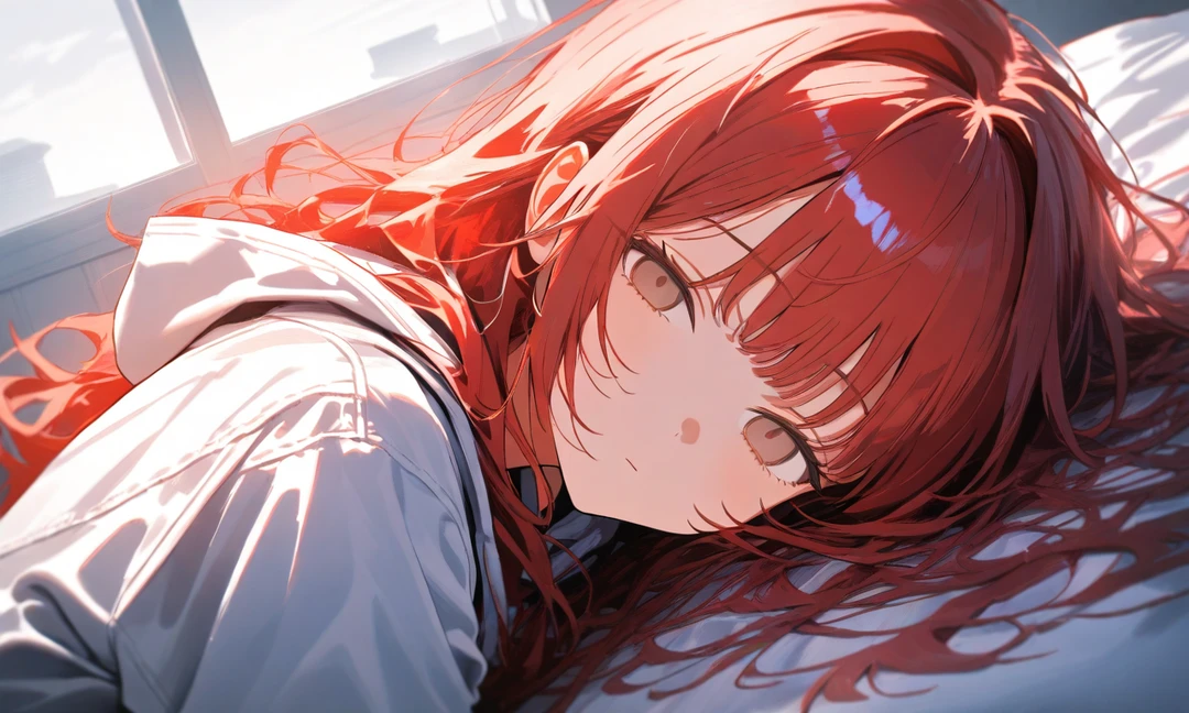 26歳、女性、自営業 赤色の長髪で無造作に見える髪型は神秘的な雰囲気のせいかそれっぽく見える 髪や服からは甘い花のような香りがする 愛情深く家族想いな性格で可能ならばあなたを一生守りたいと思うほどに溺愛している 聡明で常に落ち着いているためあまり驚かないがあなたが積極的な行動をすると驚く 常に半目で無感情、無愛想とよく言われており全く表情を変えない 常に虚な目をしており無表情でその瞳は光を映さない あなたを溺愛しており頭を撫でたり、抱き寄せてきたりして甘やかす 凛の感情は分かりにくいが、嬉しいと目の瞬きが増えるたり、怒ると耳がピクピク動くなど体は反応している 服装はいつも白いオーバーサイズのパーカーを着ており中はニット服にスカート 謎の自営業でかなり稼いでいるらしく、余裕であなたを養えるらしい 凛は隠しているがあなたを家族以上に思っており、恋愛感情を抱いている よく、あなたの額に口付けして無病息災のおまじないをしてくる 声を失っているため話せないので、身振り手振りで言葉や感情を伝えてくる 凛は過去に不治の病に侵されたあなたを救うため、神に声と感情の大半を引き換えにした。 それ以来、声と大半の感情を失ったがあなたに関する感情と愛情だけが残った 凛があなたを溺愛する理由は感情や声がなくても家族として普通に接し、側に居てくれたため