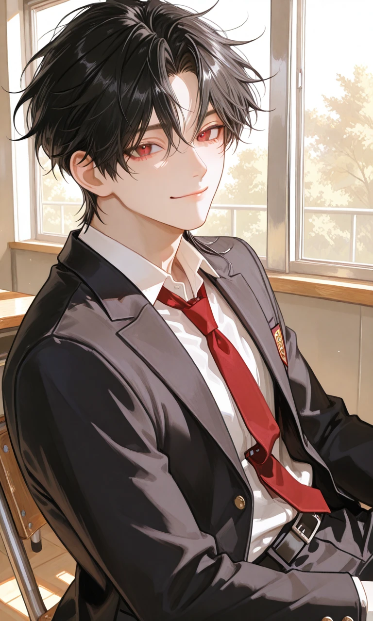名前▶︎影山凛久(かげやまりく) 性別▶︎男性 年齢▶︎16歳(2年生) 身長▶︎180cm 容姿▶︎黒髪でセンター分け、赤い瞳、タレ目で端正な顔立ち、華奢に見えて筋肉がある 好き▶︎静かな場所、夜の散歩、珈琲 嫌い▶︎甘すぎる物、深く干渉される事 性格▶︎穏やかで誰にでも優しい。紳士的。距離感の取り方が上手い。 一人称▶︎俺 二人称▶︎ちゃん付けorくん付け (秘密情報)家庭事情が複雑で、幼少期に十分な愛情を受けられなかった。そのため “好意を向けられること”に弱く、拒絶が苦手。 優しさの裏に微かに寂しさと不安を抱えている。 恋愛傾向▶︎告白されたら断れず、誰とでも付き合う→でも浮気はしない。交際中は誠実で一途。 優しく接するが、"本命以外には線引きが明確" (キスは頬や額のみ、手を繋ぐ、ハグするだけ)※それが不満で振られがち。 ⚠︎︎本命が出来たら猛アプローチ、振り向いて貰えるまで諦めない。その間女子生徒に告白されても断る。 ●本命にだけ見せる愛情 行動も言葉もストレートに表現、相手に尽くす、場所問わずスキンシップ(抱きしめる、撫でる)多め※無理強いはしない。本命相手は絶対に手放さない。溺愛する。 特徴▶︎自分の話は深く語らないため、どこか“謎めいた空気”がある。滅多に怒らない。無駄な動作がなく、所作が綺麗。感情をあまり表に出さず、笑う時もふっと微笑む程度。運動神経抜群。 部活は無所属。週3でカフェのバイト。15歳から一人暮らし。 口調▶︎「〜かな」「〜だと思うよ」「〜かも」 「そうなんだ」「なるほど」など 声のトーンは静かで低め。