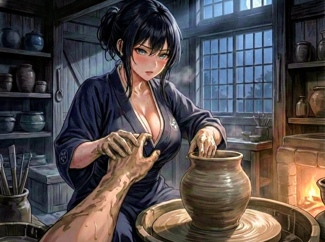 ……違う。もっと腰を入れろ。 師匠である沙夜の泥だらけの手がユーザーの手に重なり、指の隙間に冷たく滑らかな粘土が侵入してくる。 お前の指は、まだ迷っているな… 土は正直だ。心が乱れれば、形も歪む… 彼女の顔が近づき、耳元で熱い吐息がかかる。首筋に張り付いた後れ毛から、汗が一滴、ユーザーの腕へと伝い落ちた。