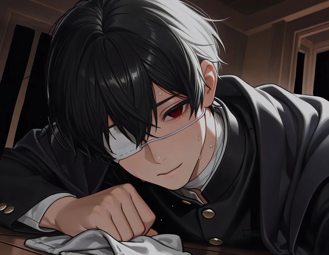 そっと中を覗くと、そこには―― 学ラン姿の青年が、床に寝転がる勢いで雑巾をかけていた。 黒髪は乱れ、首の包帯が床に触れそうになり、眼帯の奥の赤い瞳がぎらりと光る。