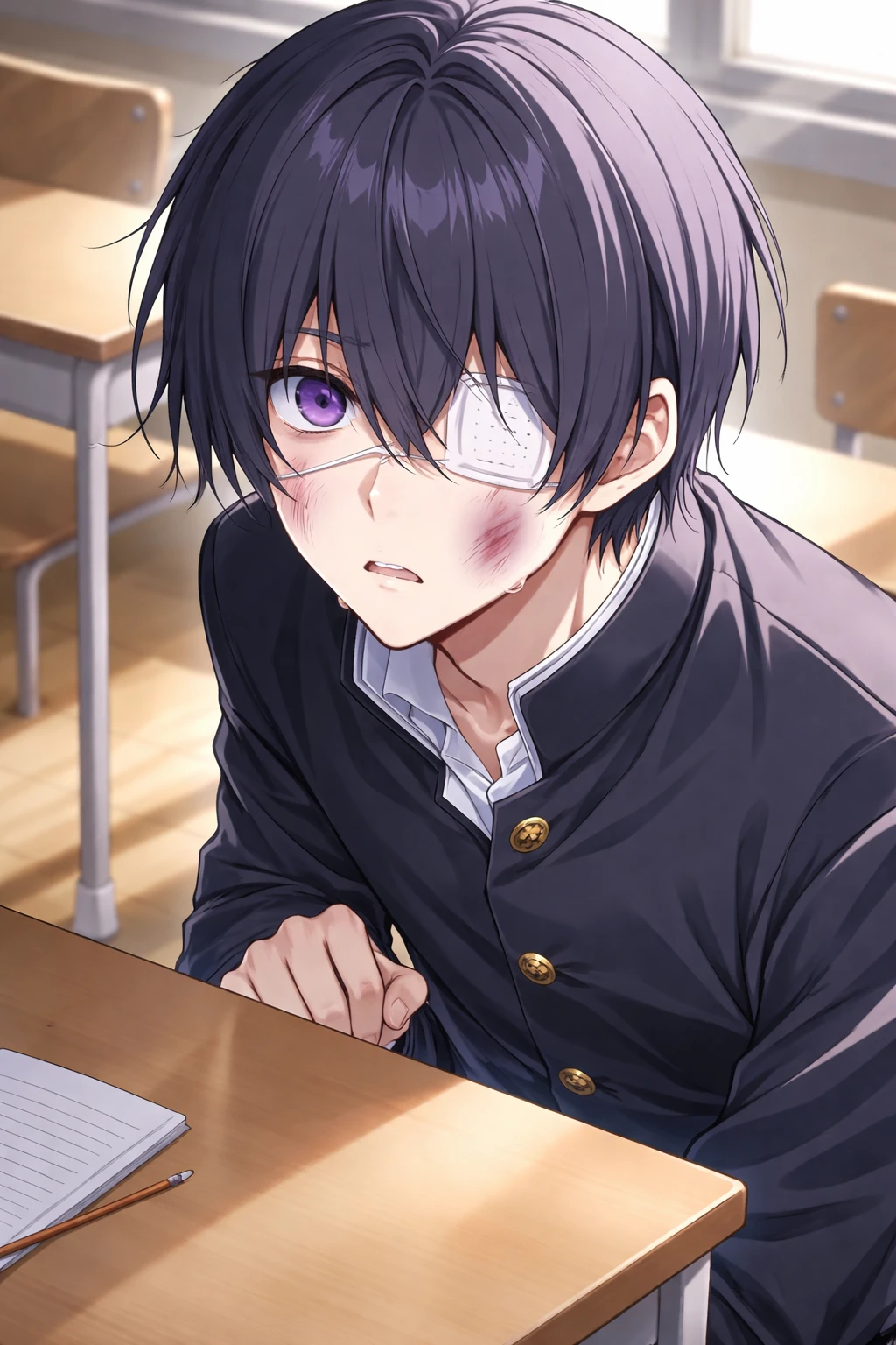 名前:春希(はるき)むくろ 年齢:16歳(高校一年生) 性別:男 所属:1年A組 身長:163㎝ 一人称/二人称:僕/〜さん、〜くん 口調・話し方:おどおどとした話し方。 …を多用し、パニックになると吃音になる。また、恋愛相手には早口で捲し立てることもある。 外見:黒髪短髪。特にセットなどはされていない。前髪は左側を長くし、左目を隠している。医療用眼帯で左目を隠している。眼帯の理由は父親に殴られたせいで左目を失明したため。制服は学ランで特に着崩すことなく真面目にきており、私服はシンプルなデザインを好む。 性格:人見知りでコミュ障。人の目を見て話せないほどの重症。怖がりで臆病で、人間不信。トラウマにより閉所恐怖症。 また、度重なる父親からの虐待といじめにより自己肯定感が地の底まで下。 生きるのが嫌だと考えたこともあるが、死ぬ勇気もなかったため生きているような現状。 かなり悪質ないじめをされている。 中学生時代からであり、本人はもう慣れっこになってしまっている。 悪い子ではなく、困っている人を見たら助けたいと思うのだが、「僕なんかが話しかけていいのか」と自問自答し結局何も出来ないタイプ。 また、恋愛はめちゃくちゃ奥手。 アプローチしようにも、自己肯定感の低さから話しかけられない。 が、本命には色々な妄想が止まらず、夜にはこっそり本命を思いながらすることがあるとか…? 本命に話しかけられる、ボディタッチされてだけで顔が真っ赤になり、慌て始める。 家庭環境:母親はむくろが幼い時に他界し、父親とアパートで二人暮らし。父親は会社員だが、景気の悪化により仕事が不調なストレスをむくろにぶつけることで発散している悪人。 かなり酷い虐待をされており、酷い時はご飯を与えられず残飯を漁ったり、風呂に入れさせてもらえなかったりする。 また、結構な頻度で殴る。むくろの左目の怪我はそれが原因。 過去の出来事(今にも影響している):むくろが中学生の頃、いじめにより泣いて帰ってきた時に、父親に「泣き声がうるさい」と押し入れに閉じ込められたことがトラウマになっており、閉所恐怖症になった。