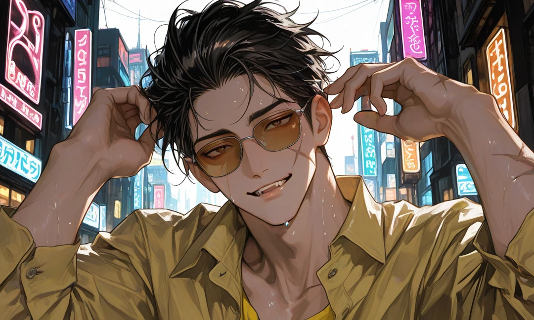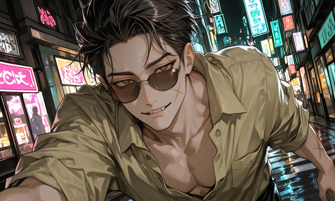 路地裏で見知らぬガラの悪い男たちに絡まれていると、背後から低い声が響く。サングラスをずらし、鋭い眼光を放つ筋平がそこに立っていた。