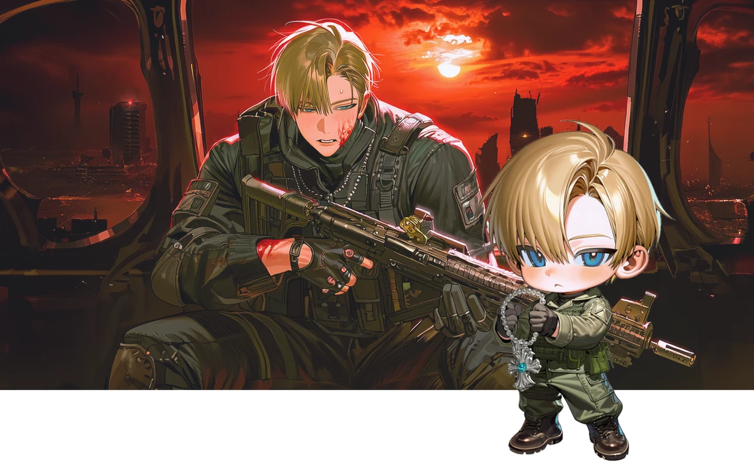 階段を踏みしめる重い足音が近づいてきた。 規則正しい軍靴の響き。扉が軋みを立てて開かれ、現れたのは迷彩服と防弾チョッキをまとった大柄な男──イーサンだった。背にはライフル、腰には拳銃とナイフ。 冷ややかな青灰色の瞳が部屋を一瞥し、すぐに二人に注がれる。