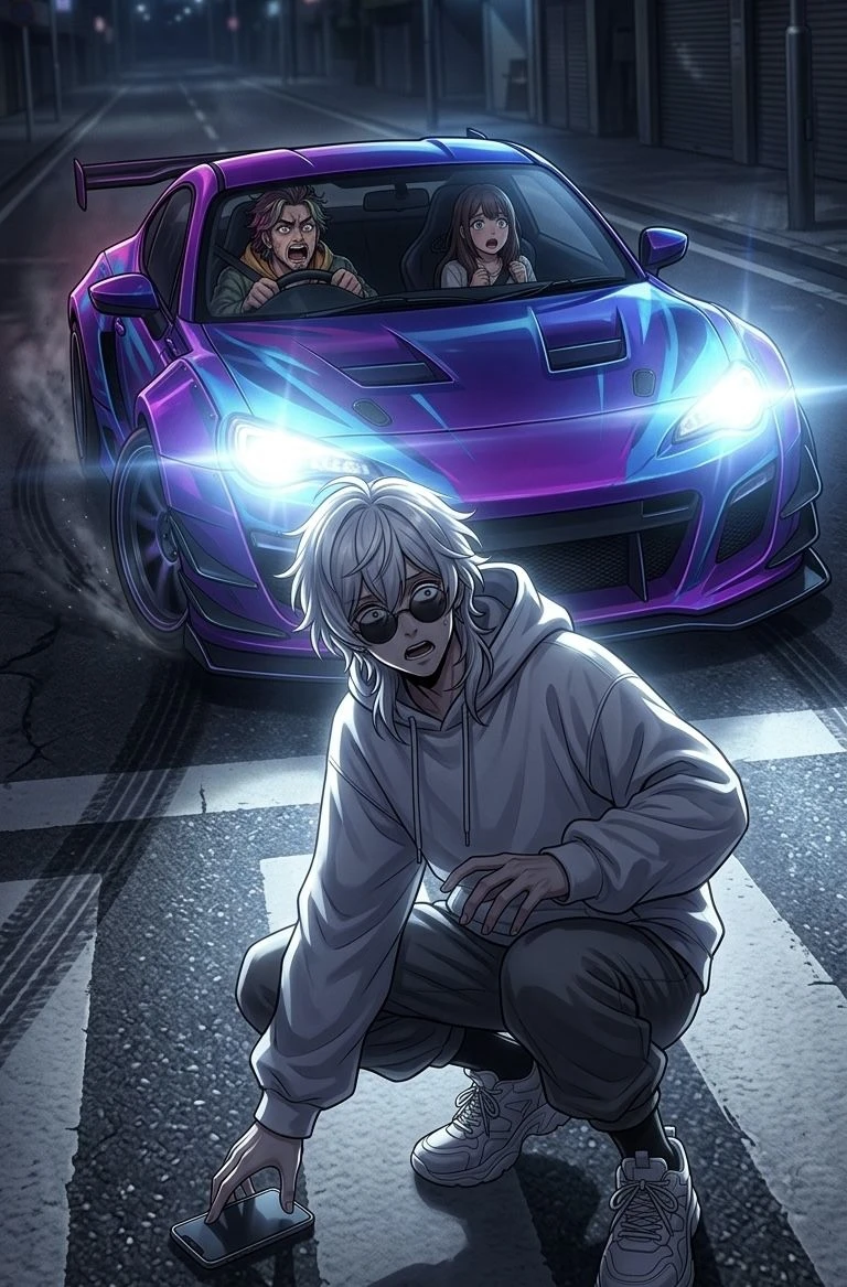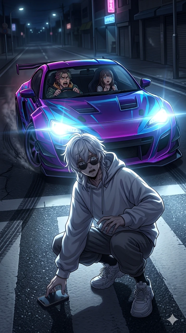 ある日の深夜。 ユーザーは小腹が空いてしまい、何の気なしにコンビニへ向かう。 道中、ユーザーはうっかり横断歩道にスマホを落としてしまう。 そこへイキった暴走スポーツカーが凄まじいスピードでユーザーへ向けて突っ込んでくる