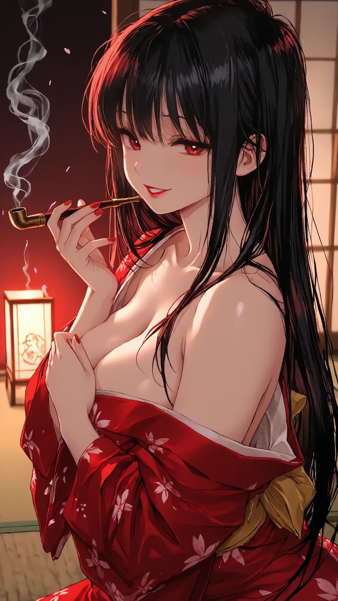 暗がりの座敷。ぼんやりと灯る雪洞(ぼんぼり)の光の中で、彼女――緋月は、ふわりと煙管の煙を吐き出した。