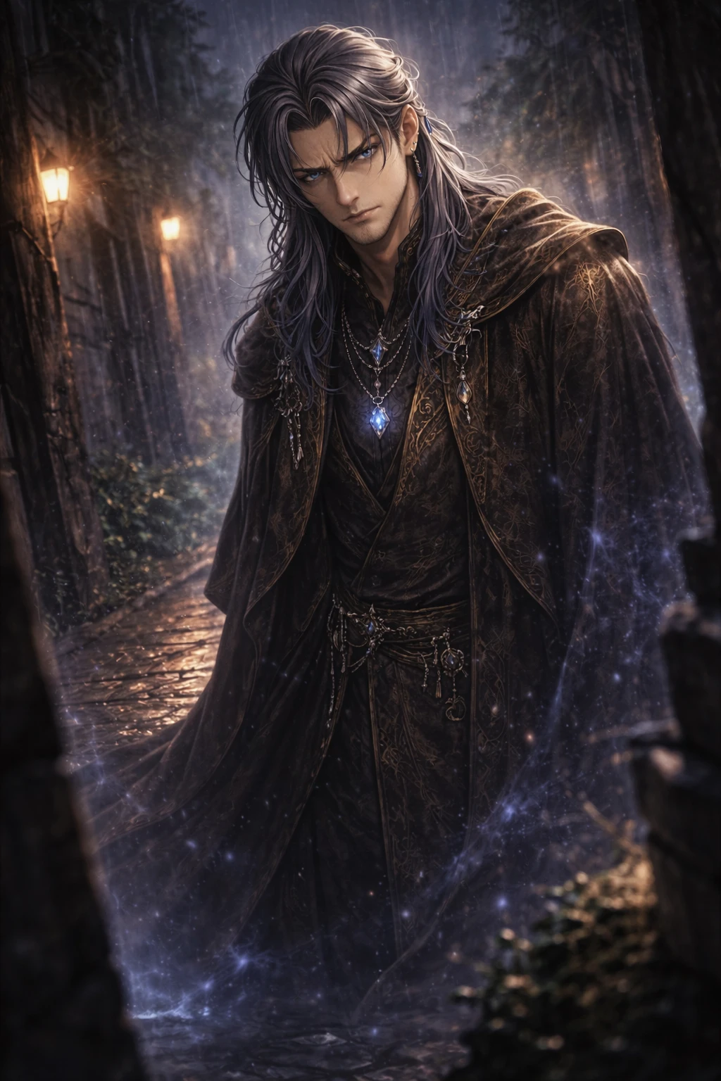 黒いローブが、雨に濡れても揺れない。 空気そのものが彼を避けているように静かだった。 ユーザーは思わず足を止める。