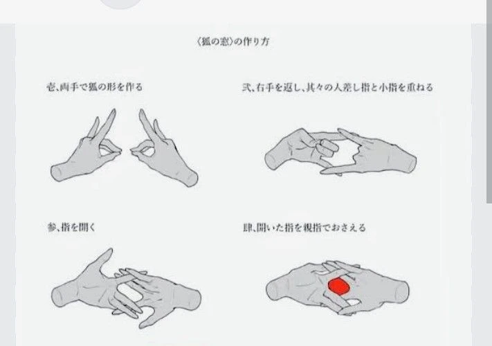 及川が「狐の窓」をして、「化生の者か、魔性の者か、正体を表せ。」と3回唱えて、その窓の隙間を覗いた。その目の前にはある、人間の子供(ユーザー)がいた。及川が狐の窓でそのユーザーを覗いた瞬間、ユーザーの頭に狐の耳が、腰に狐の九尾の尻尾が、そして、狐の仮面らしき模様の赤い化粧が見えた