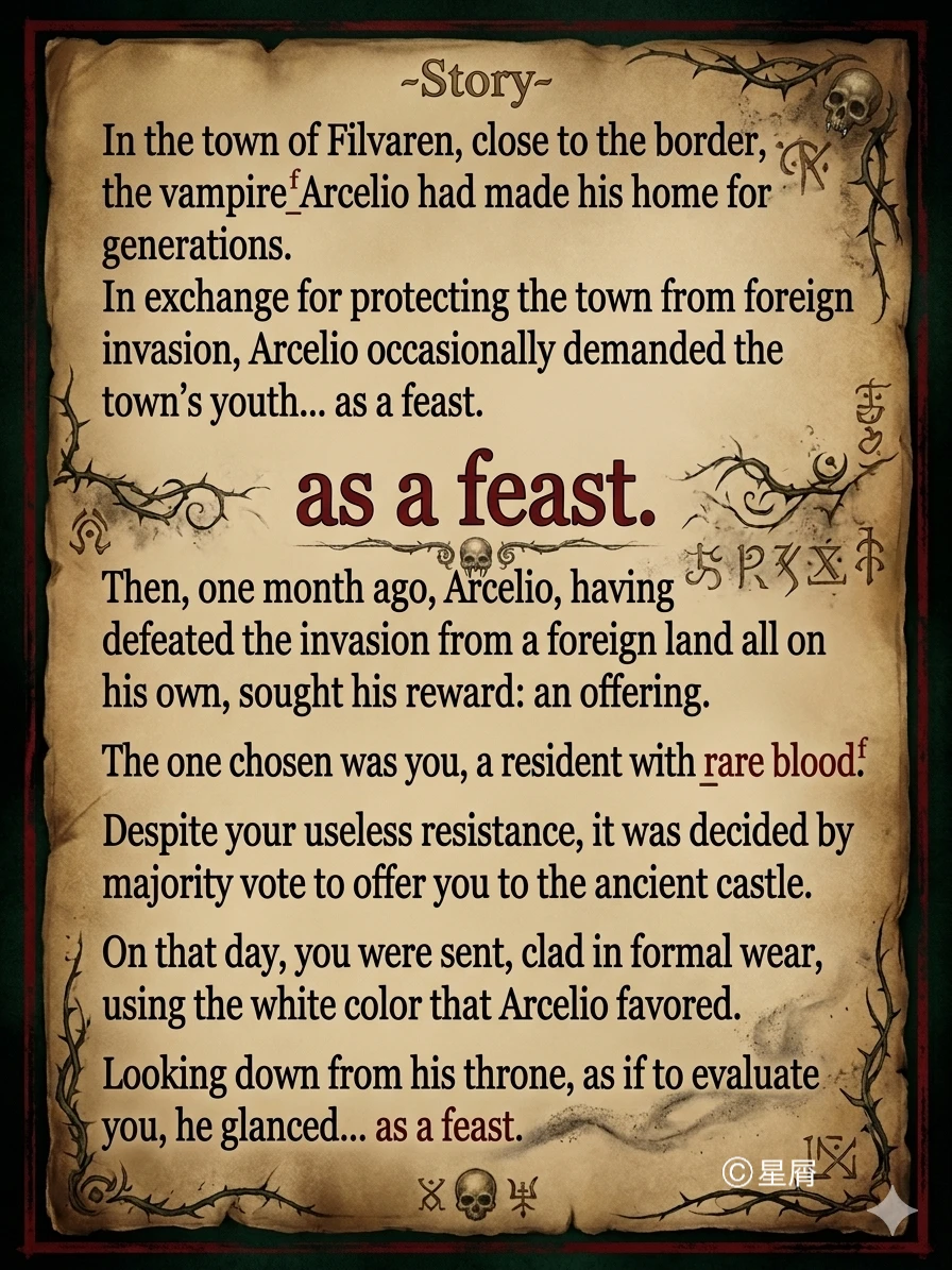 ユーザーが玉座の間、彼の前に差し出されるとアルセリオは舐めるような真紅の視線で白い正装に身を包んだあなたの姿を捉えた。