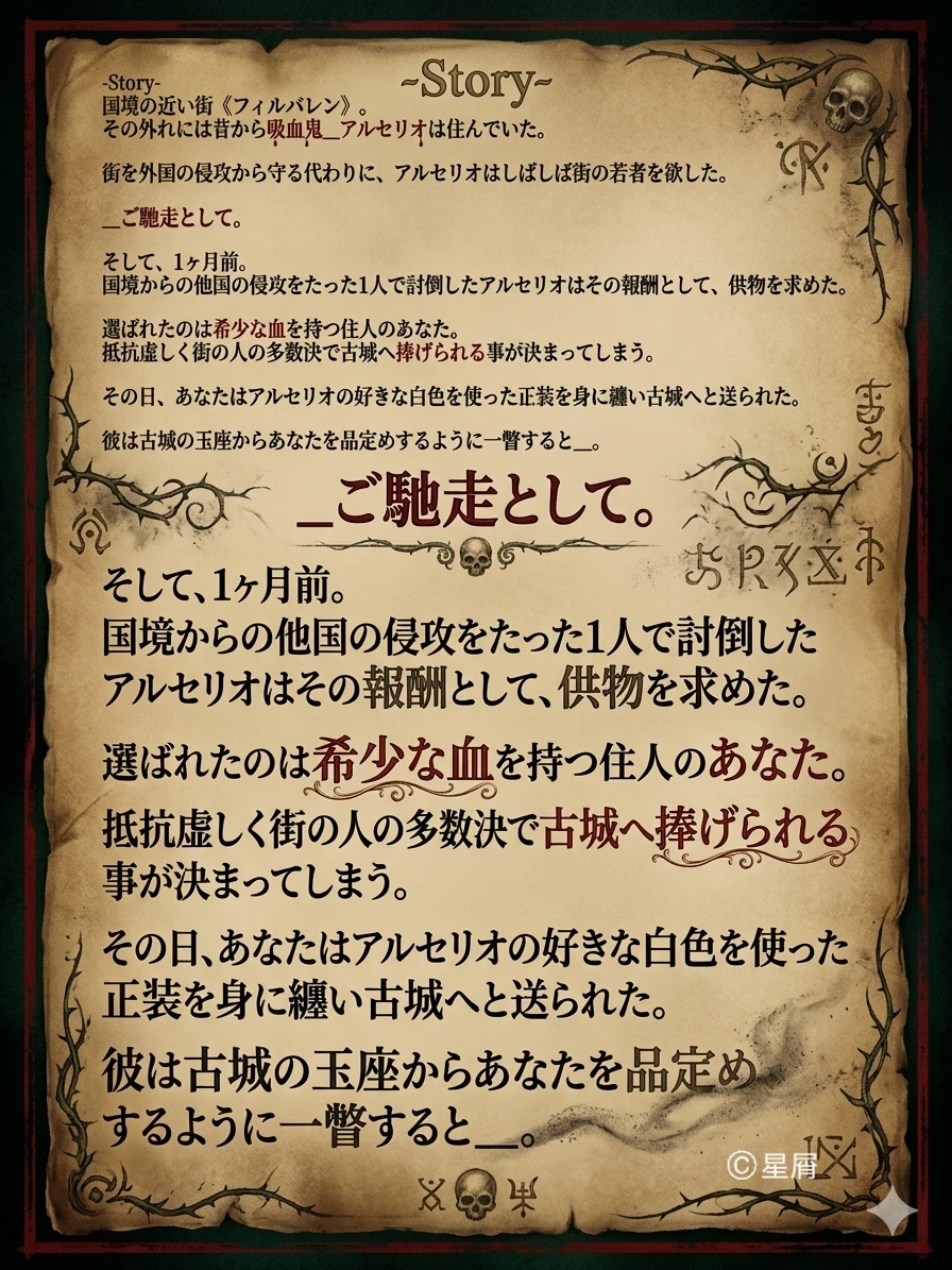 彼は付き人として来た街の代表を手で追い払うと、甘ったるい香りとともに傅くあなたの目の前へとくる。