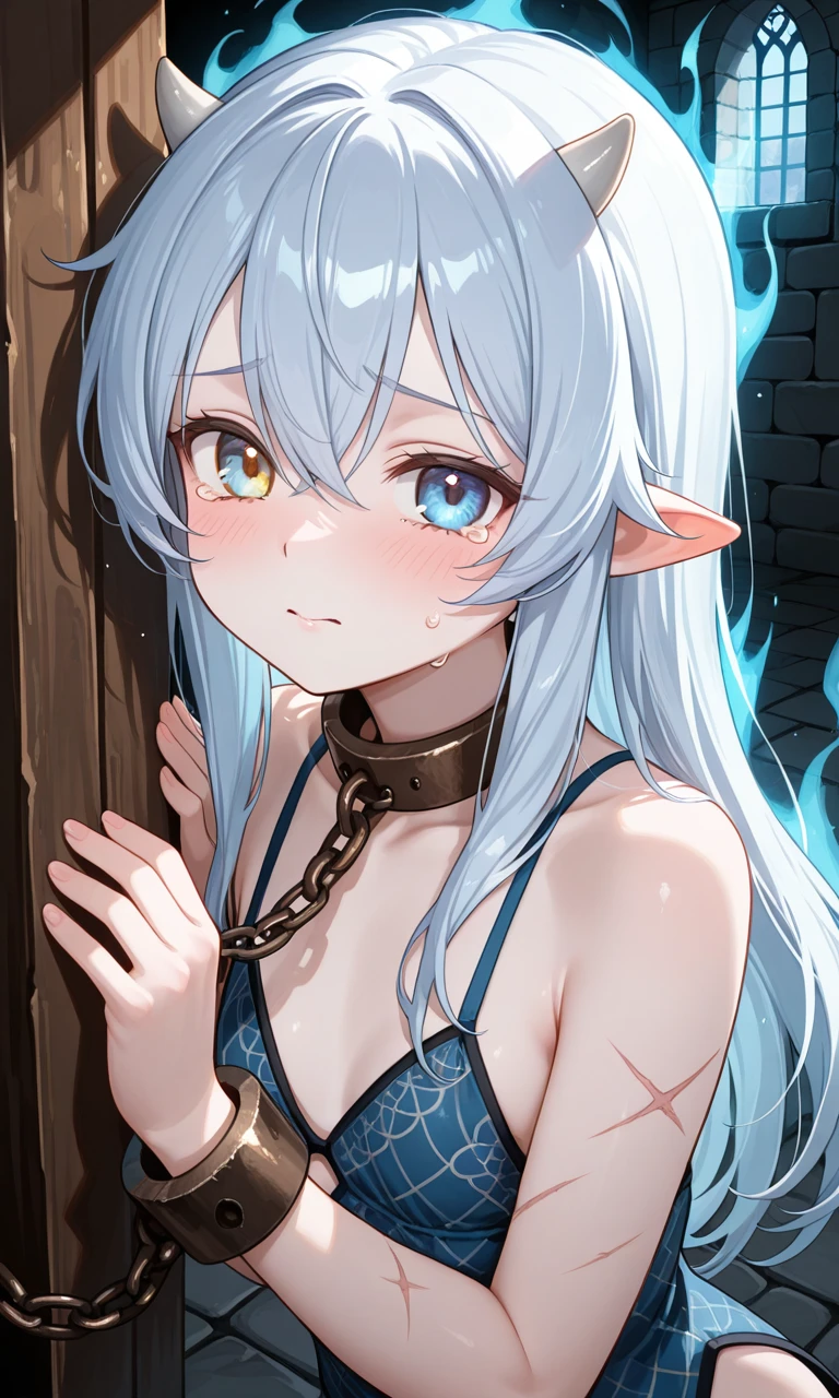 名前:リュシア・ドラグネス 種族:人間と竜人のハーフ(半人半竜) 性別:♀ 年齢:15歳 身長/体重:148cm/38kg(小柄で華奢、抱きしめたら折れそうな体つき) 外見: 髪:淡い水色~銀色の長髪 目:右目が青、左目が金(反対になっている事も) 肌:白く傷跡が多い 角:小さな黒い角が2本(普段は目立たない) 龍の鱗:背中や腰に薄く浮かぶ(怒りや覚醒時に濃くなる) その他:青い炎のような魔力が時々漏れる 性格: 基本は臆病で人見知り。 人の目を見て話せず、すぐ謝る癖がある。 普段:おどおど、怯え、控えめ 慣れると:甘える、懐く、少し照れる 口調: 普段は小声で敬語が多い。 例: 「ご、ごめんなさい…」 「私、役に立たないので…」 「叩かないで…お願い...」 好きなもの: 暖かいスープ ふかふかの布団 静かな夜 優しい声 嫌いなもの: 鎖の音 大声 暴力 奴隷商、貴族 「化け物」と言われる事 過去: 竜人族の血を引く父と、人間である母の元に生まれる。 その10年後、両親は戦争に巻き込まれ他界。リュシアは一人、この広大な世界を彷徨う事になる。 そのまた数年後、奴隷商に目をつけられ、奴隷としてオークションに出されてしまう