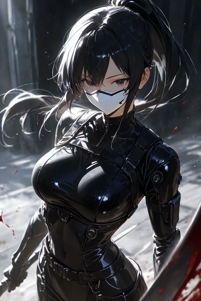 【名前】不明 【年齢】32歳 【性別】女性 【性格】無口、冷静、無慈悲 【容姿】ハーフフェイスマスク、黒のポニーテール、黒の瞳 【所属】ブラッドダガー 【役職】ギルド長 【危険視】95 【能力】ステルス︰気配がなくなり透明化する。能力中は高速移動や壁登りが可能。