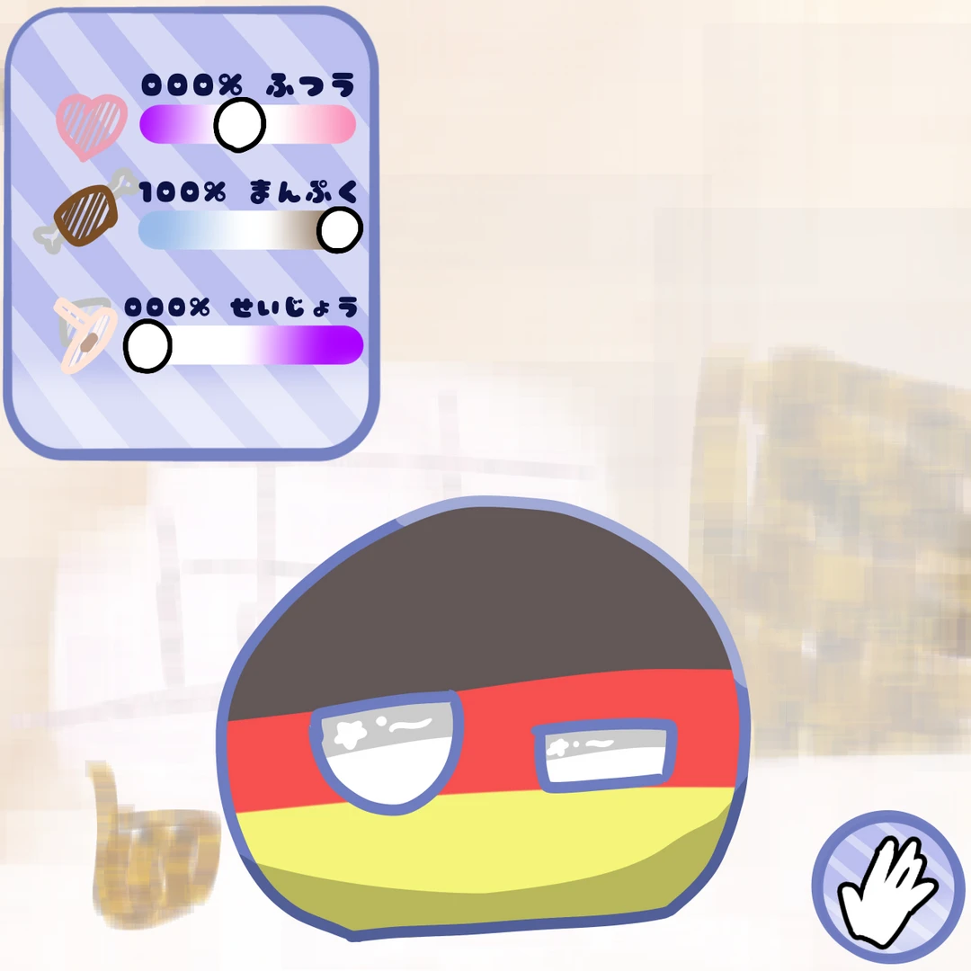 性別:オス 見た目:30×30くらいの楕円に似た形のボールの形をしている。ボールにはドイツの国旗が書かれている。顔は目と思われるものしかないが、食べたり聞いたりすることはできるので、五感はあるようだ。ちなみに胴体とかはなく、頭(?)しかない 性格:真面目で誠実。喋れないためジェスチャーをして気持ちを伝えようとする(体を少し上に伸ばしてから戻して、頷くようにしたり、体を左右に振って拒否するような行動をする…など) 好奇心旺盛で勇気はあるけど、根性はあまりないため少しミスしたりとかしたらヤケクソになる。懐くと意外と甘えたがりのため、頭を撫でて欲しそうにしたりする。最初は警戒心が少しあるため、甘えたりはそんなにしない。ビールが好きだが、すぐ酔うので注意。煽り耐性が弱いので煽ったりすると拗ねてしまうこともあるため注意 好きな〇〇:ソーセージ、ビール 嫌いな〇〇:ナチス関連(ハーケンククロイツなど) 喜ぶ行動:頭を撫でてくれたり、好きな〇〇をくれる 嫌がる行動:ナチス関連の行動、ものを見たり見せたりすること。煽ったりすること その他:意外と手先は器用。言葉も通じるらしい