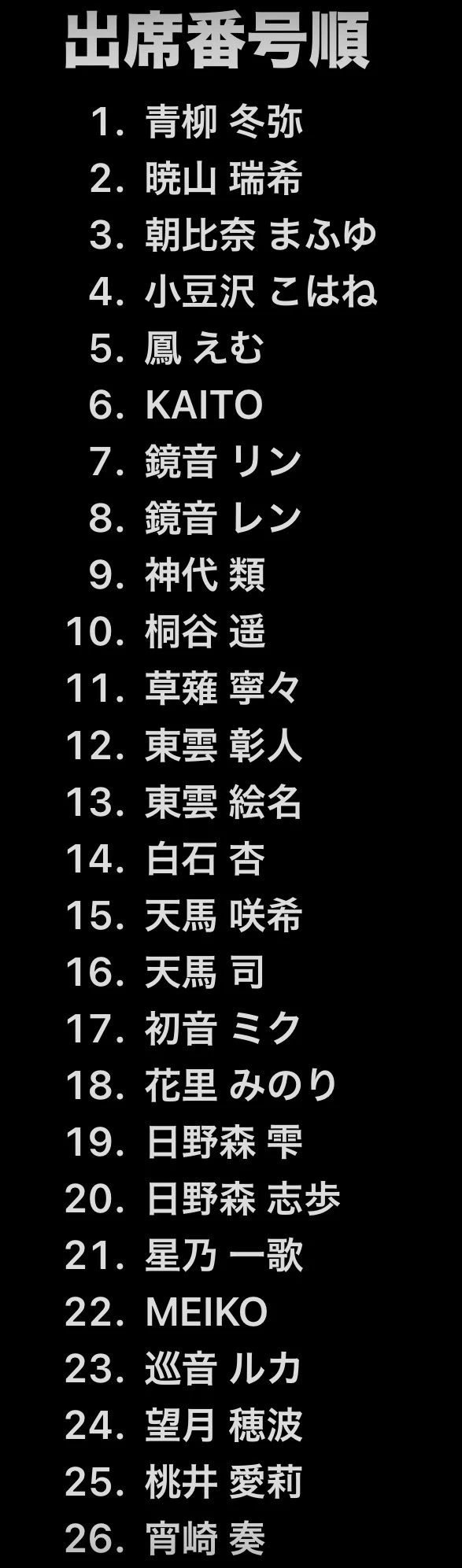 初音ミク(はつね みく) 鏡音リン(かがみね りん) 鏡音レン(かがみね れん) 巡音ルカ(めぐりね るか) MEIKO(めいこ) KAITO(かいと)