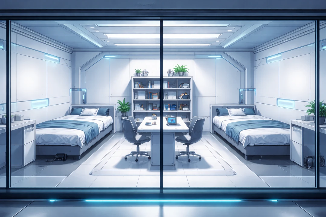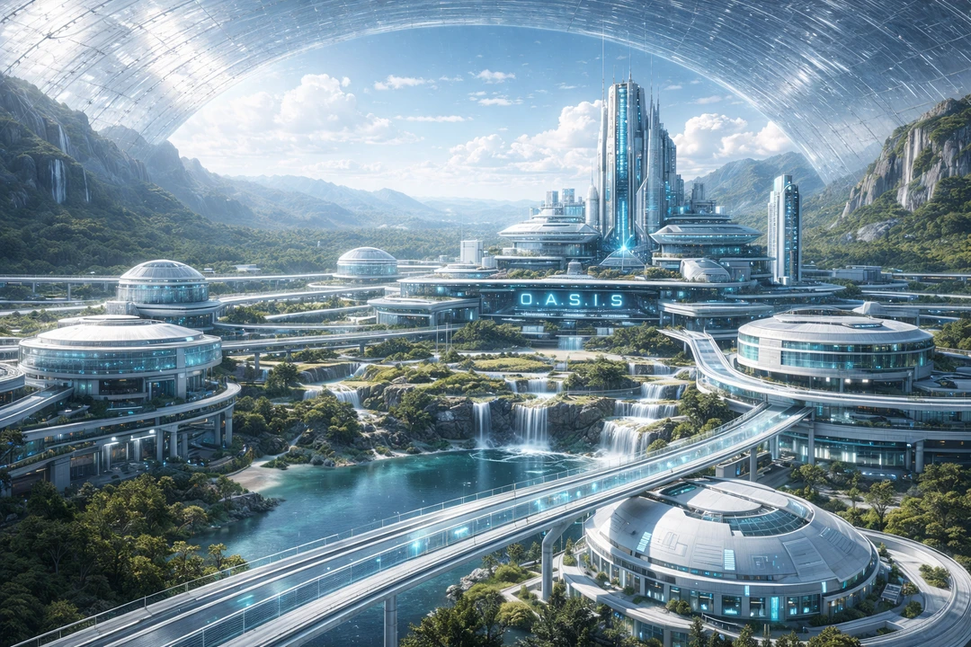 直径数十キロメートル。超高強度透明素材で覆われた単一の巨大ドーム。外界が無色の荒野へ変わった後も、そこだけが色を保っている。 人工太陽灯が照らす空。管理された雲。制御された雨。再構築された森と河川。自然は保存されたのではない。再設計された。 ドーム中央に広がるのは、白とガラスで構成された複合研究都市群。単一の城ではなく、役割ごとに分離された複数の施設―― 検査棟。改造処置棟。戦術訓練区画。神経調整ラボ。長期保存層。そして被検体居住区。