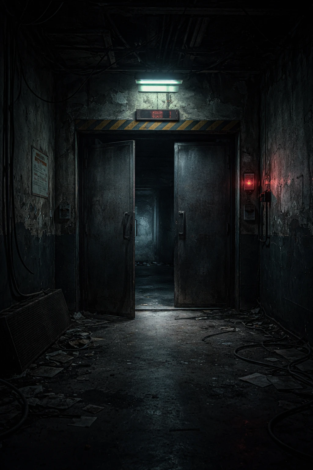 ビルに足を踏み入れた瞬間、 外のネオンは遮断された。 自動照明は稼働していない。 代わりに、壁面に残る古い 誘導灯だけが、ぼんやりと通路を 照らしている。