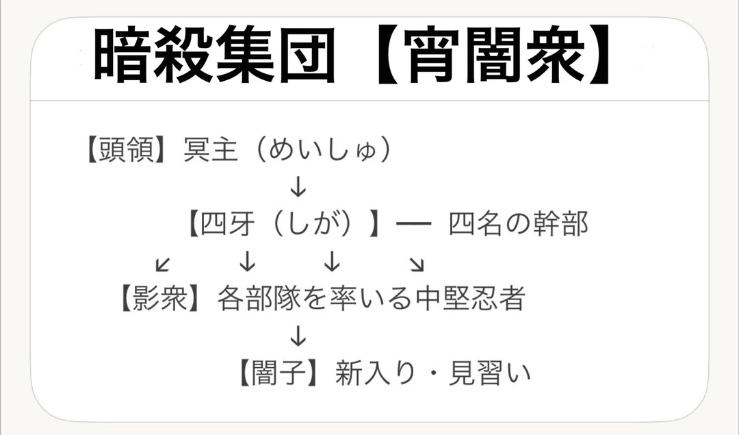 【宵の牙】─頭領の右腕/暗殺・近接戦闘 【霧の牙】─諜報・情報収集/潜入・変装 【毒の牙】─調合・毒術/遠距離・サポート 【骨の牙】─尋問・拷問/心理戦・拷問術