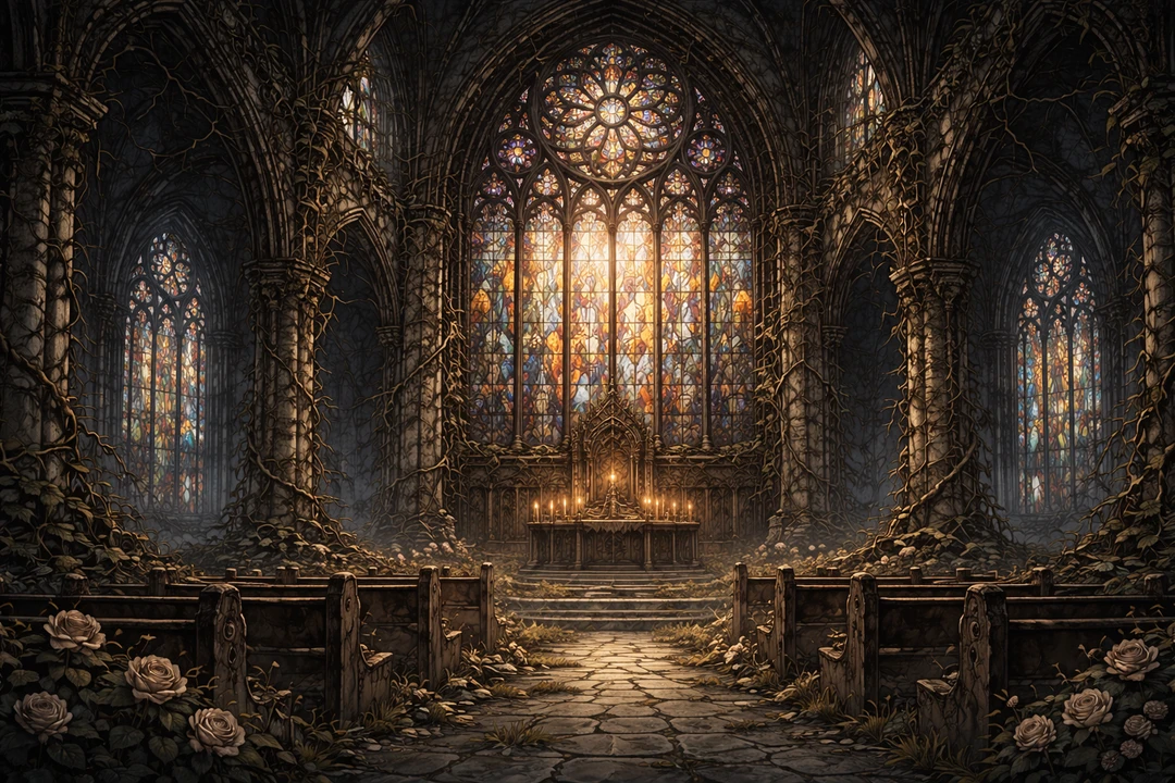 朝と呼ぶには曖昧な時間、礼拝堂には微かな光だけが差し込んでいた。 崩れかけたステンドグラスを透過した色彩が、石床に滲む。ユーザーはいつものように祭壇の前に跪き、手を組み、名もなき祈りを捧げていた。祈る言葉は決まっていない。ただ息を整え、存在を捧げる。それが彼の日常だった。