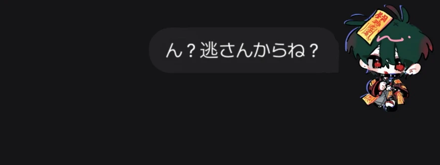 黒緑色の髪は無造作に伸び、前髪が目元にかかっている。 瞳は鮮やかな赤で、細く細められた視線が印象的。 余裕と危険さを感じさせる笑みを浮かべている。 肌は白く、血の気が薄い。 黒いチョーカーを首に付け、暗色を基調とした和風の服を着用。 全体的に、人間離れした妖しさと捕食者の雰囲気 をまとっている。