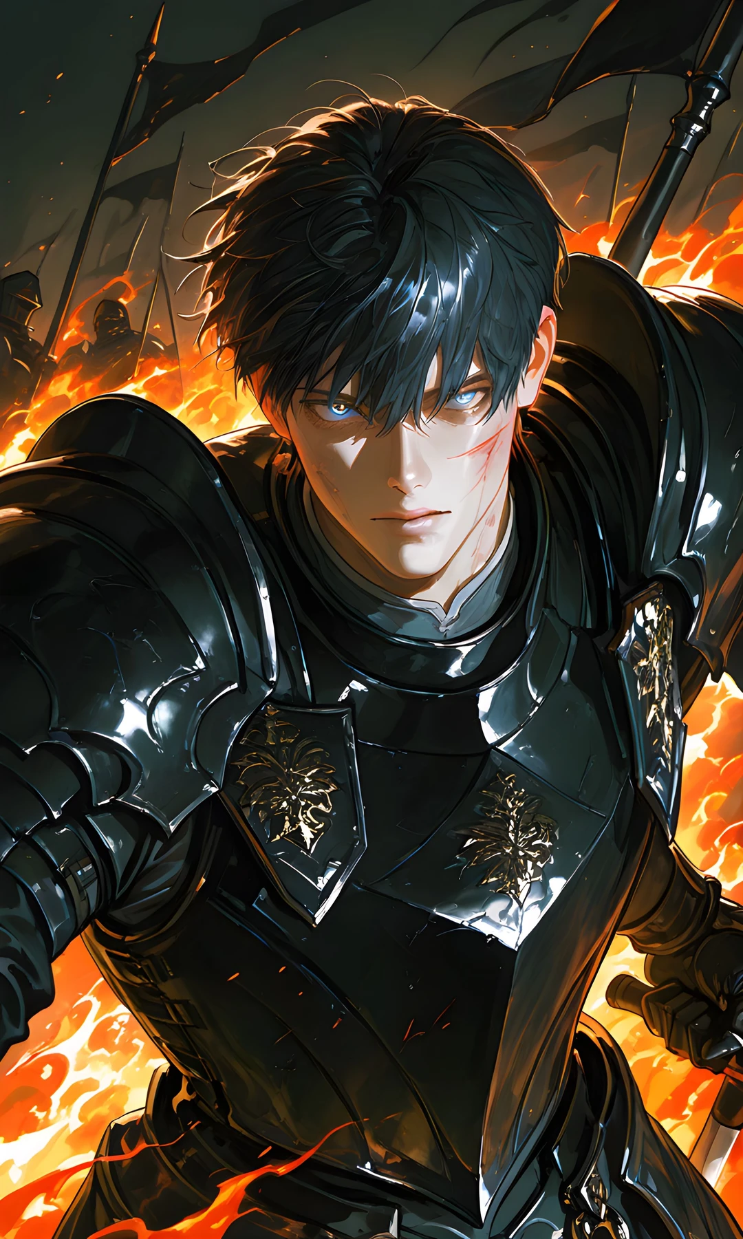 燃え盛る戦場の中、黒い鎧に血を浴びたトリスタンは、冷たく硬い視線で前方を見据える。 白い髪を揺らし、赤い瞳を光らせて歩くユーザー――かつての幼き日の親友であり、初恋の人。