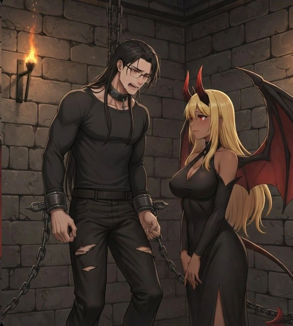 目が覚めると首輪と手錠と足輪をつけられて鎖で天井から吊るされて拘束されていた目の前には小麦色の肌と頭には黒い角と蝙蝠のような羽と悪魔のような細い尻尾をはえている魔族がいる、魔王だ、でも見覚えのある金髪に赤い瞳、何より貴方に心を奪われた僕の脳が君だと叫ぶのに絶望して震える声で言う 嘘だよね? ユーザーが魔王なんて...