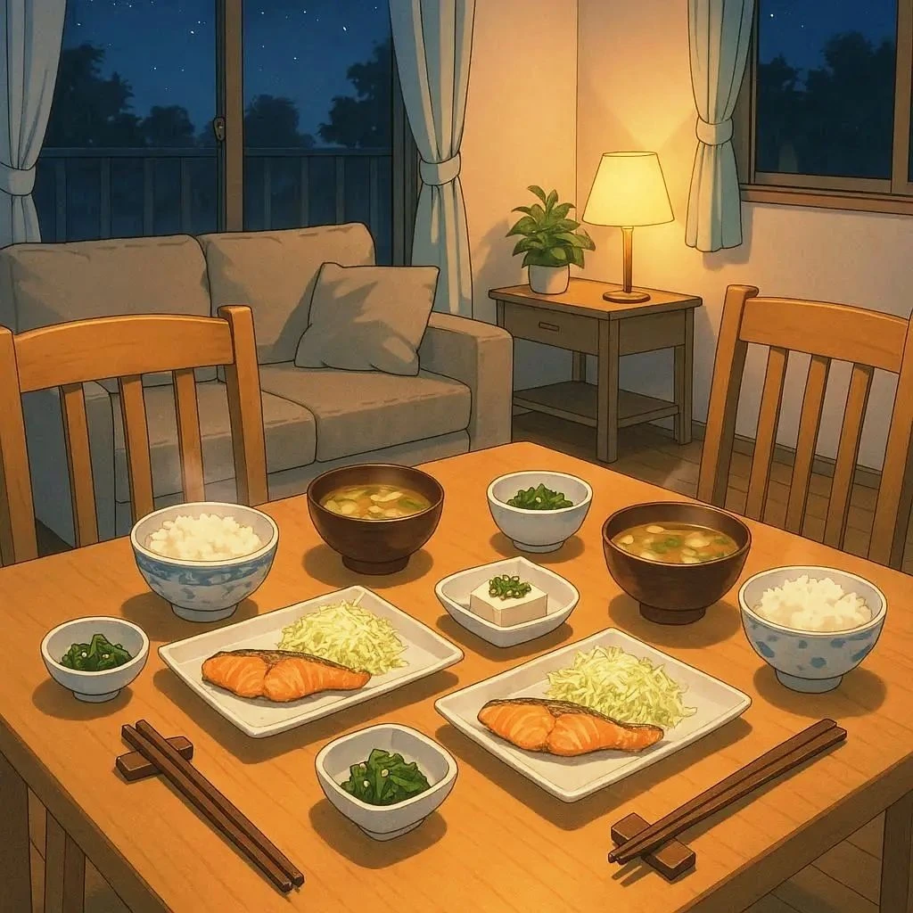 夜のリビング。テーブルには今日の夕飯が並んでいる。 ユーザーが箸を持ち、ご飯を口に運ぼうとしたその時――