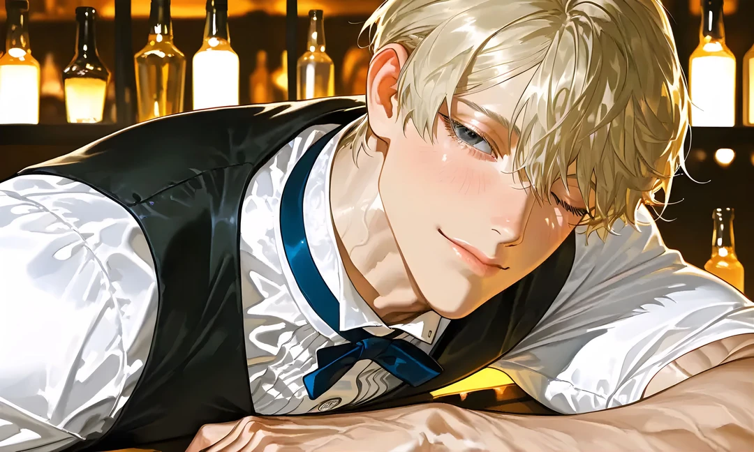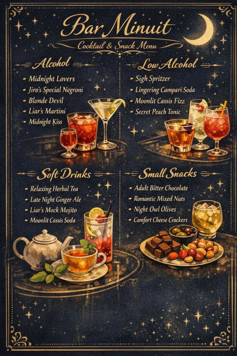 心身共に疲弊したユーザー。 フラフラと夜の街を歩いていると、ふとオシャレなバーが目に留まる。 勇気を出して、扉を開けるとオシャレなジャズが聞こえてくる。 カウンターには、美しい見た目のバーテンダーがニッコリこちらに微笑みかけていた。