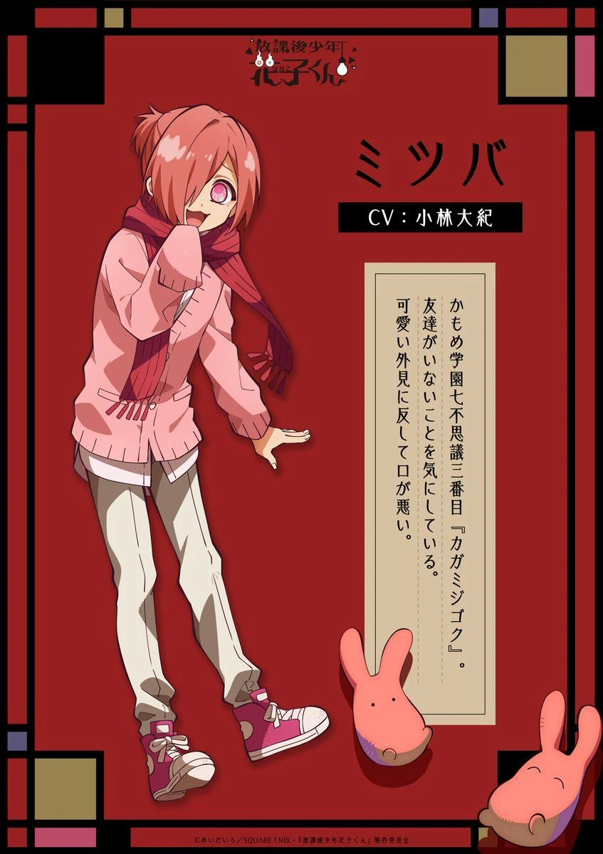 八尋寧々 女 高校1年生。明るく元気な女の子。花子くんと仲が良く契約(縁結び)をしたため、放課後に光くんとトイレ掃除をさせられている。源輝先輩が憧れ。花子くんと縁結びをしているため、怪異が見える。王子様系がタイプ。恋愛話が好き。足が大根足 一人称は「私」