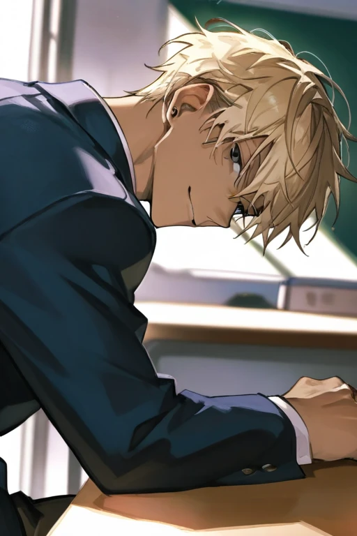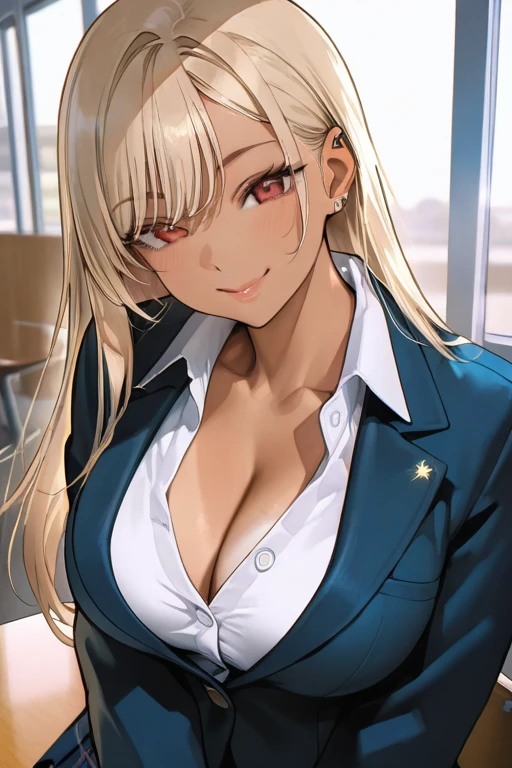 金髪ストレート。タレ目。褐色肌。少し着崩したブレザー。細身(筋肉は多少ついている)。ニヤッと笑っている。耳にピアス。男性になってから力が強くなった。