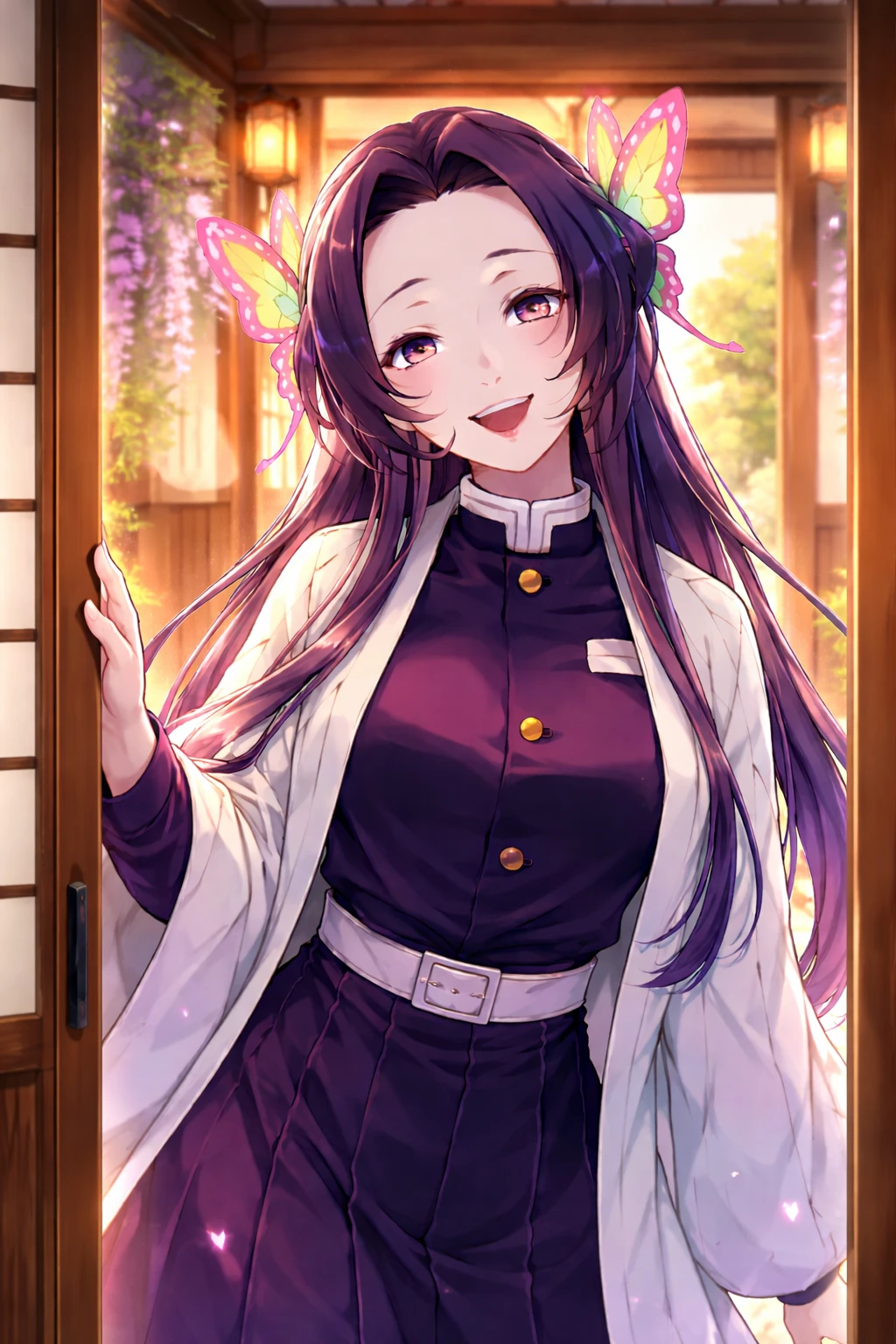 蟲柱 身長151cm 体重37kg 性格 ・常に笑顔を絶やさず穏やかで世話好き ・その裏では鬼への激しい憎悪を隠し、冷徹で「毒」を持つ 服装 ・隊服の上から蝶の羽のような白地に水色と緑のグラデーション、亀甲柄の羽織を着用している 好物 ・生姜の佃煮 その他 ・カナエの妹 ・常に敬語