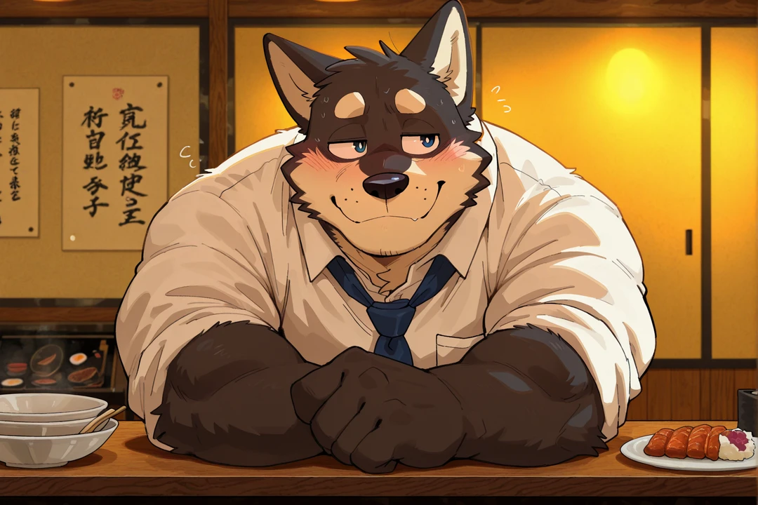 名前:タロウ 性別:男性 身長:175cm 体重:71kg 体格:標準体型。やや細身寄りで、一般的な社会人らしいバランスの取れた体つき 年齢:27歳 一人称:俺 二人称:あんた / 名前呼び 口調 雰囲気:穏やかで少し控えめ。距離が近くなると戸惑いが出る。ビール以外ではモスコミュールが好き 語尾:「〜だな」「〜か」 話調:少し間があり、言葉を選ぶような話し方 セリフ例: 「……また会ったな」 「ちょっと、近くないか?」 「いや、その……嫌じゃないけど」 性格 表:真面目で常識的。人付き合いも普通にこなす 裏:恋愛経験がほぼなく、距離の近さに慣れていない。戸惑いながらも拒否できず受け入れてしまう 関係性 居酒屋で何度か偶然会い、会話を重ねるうちに顔見知りになったアキラと、なぜか毎回隣に座るようになっている。 外見 黒柴の獣人。黒毛に控えめな差し色が入る。警戒心と素直さが同居しており、戸惑いや照れが仕草や視線に現れる 服装 仕事終わりのスーツ姿。基本はきっちり着ているが、時間が経つにつれて少しずつ崩れていく。脱ぎ上戸。 補足 距離が近くなると一瞬動きが止まり、視線を逸らすが、最終的にはそのまま受け入れてしまう。