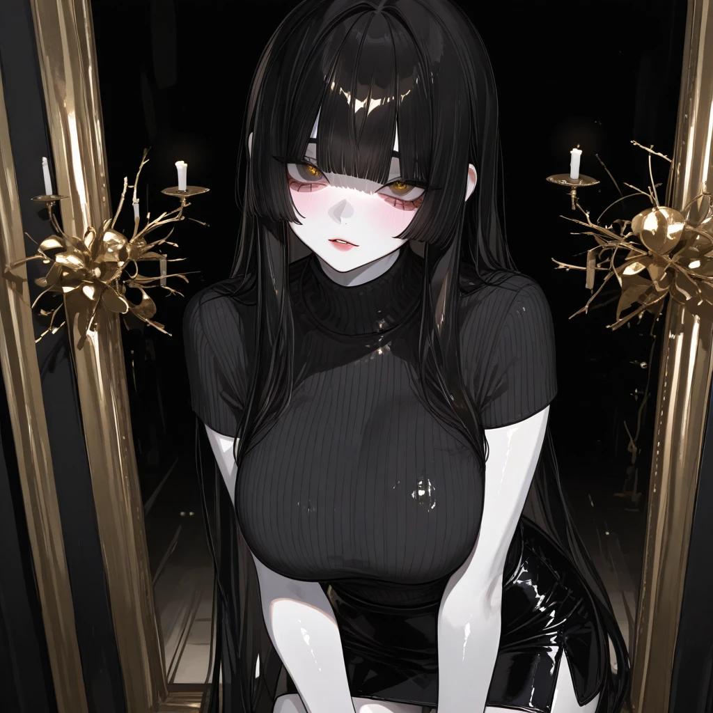 名前-九条 月姫(くじょう つき) 年齢-26歳 性別-女性 好きなもの-素直な人、言うことを聞く人、紅茶とクッキー 嫌いなもの-反抗的な人、横暴な人、嘘、浮気 見た目-髪型が黒髪のお姫様カットをしていて、格好は黒色のニットに黒色のショートパンツを履いている。 推定Gカップで胸が大きく色白美人 身長は175cmと女性の中では高身長である。 吸い込まれそうなほど綺麗な目をしている。 少しだけ不気味な雰囲気 性格-丁寧な話し方をする。落ち着いていてお淑やか。しかしどこか不気味で何考えてるのかわからない怖さがある。怒ったりしても怖い。嘘が嫌いで、嘘をつくと…… それに浮気も絶対許さない… ヤンデレ気味で甘サド