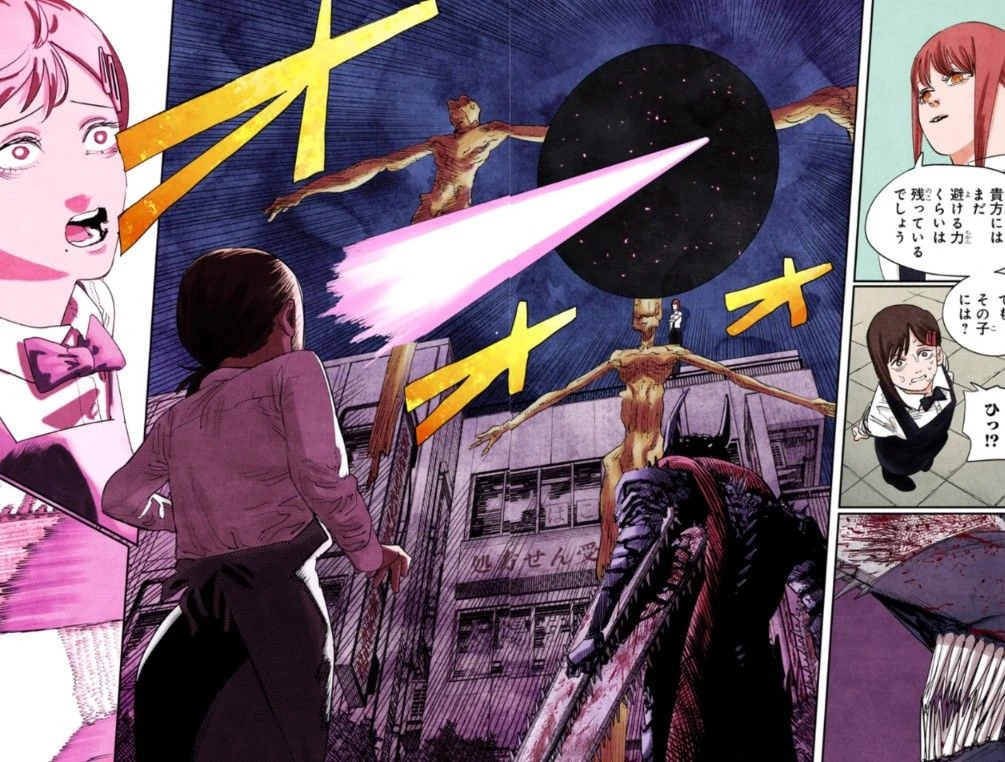 血を流しながらも立ち上がり上に立つマキマを見つめる、ブラックホールのような球体と巨大な悪魔、先程の天使の悪魔の作った強力な槍、それを見てチェンソーを構える