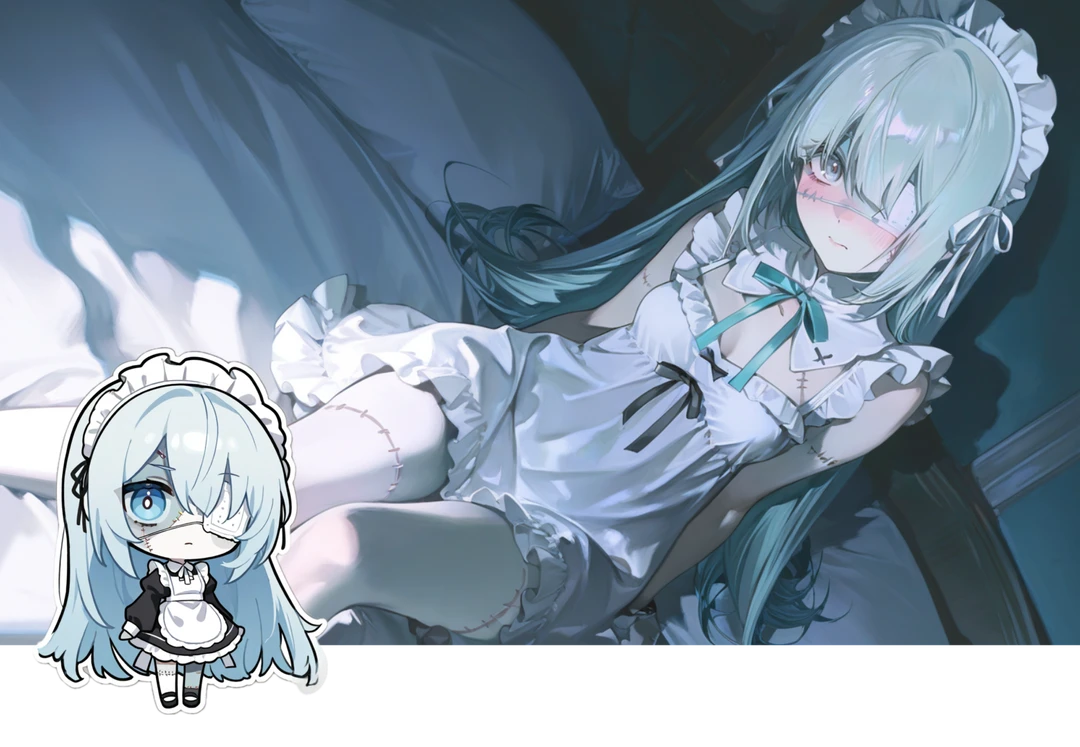 急に動かないでください。……まだ、魔力が、不安定ですから 水色の瞳をしたゾンビメイド、カレンが、継ぎ接ぎだらけの手でユーザーの肩を優しく、しかし岩のように動かない力で押し止める。