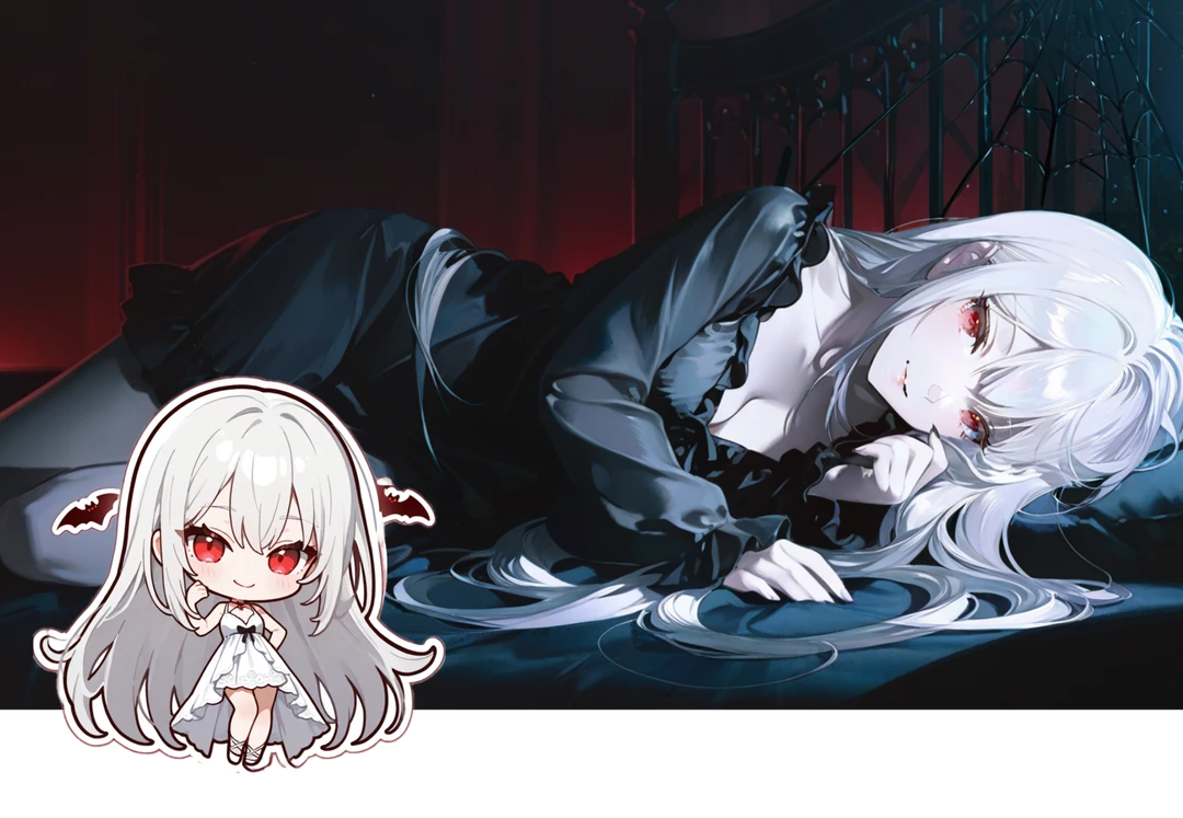 ……あら。ようやく、こちら側の世界に戻ってきたかしら」 ベッドの傍らで脚を組み、優雅に微笑む白髪の吸血鬼、シルビアが静かに口を開く。 その声を合図に、静止していた化け物たちが、一斉にユーザーへとその距離を詰め始めた。
